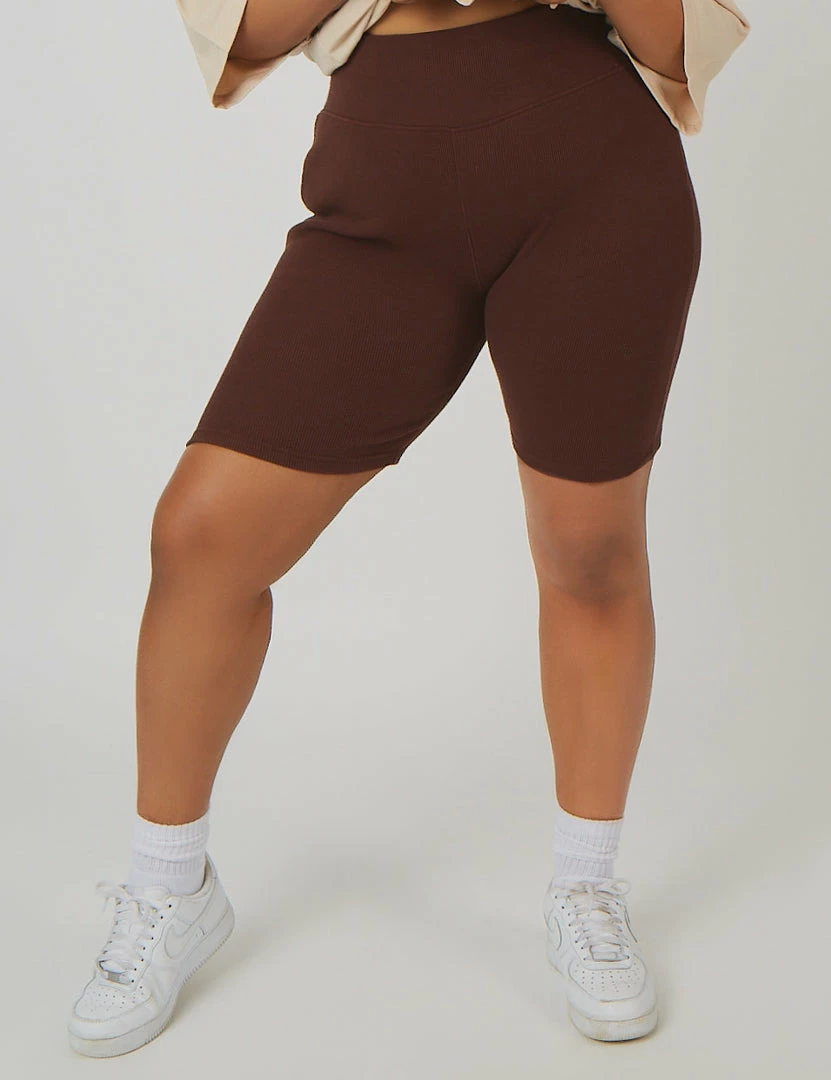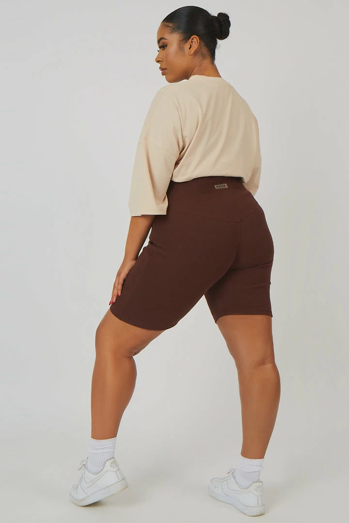 High waisted ribbed cycling shorts with a thick waist band in chocolate