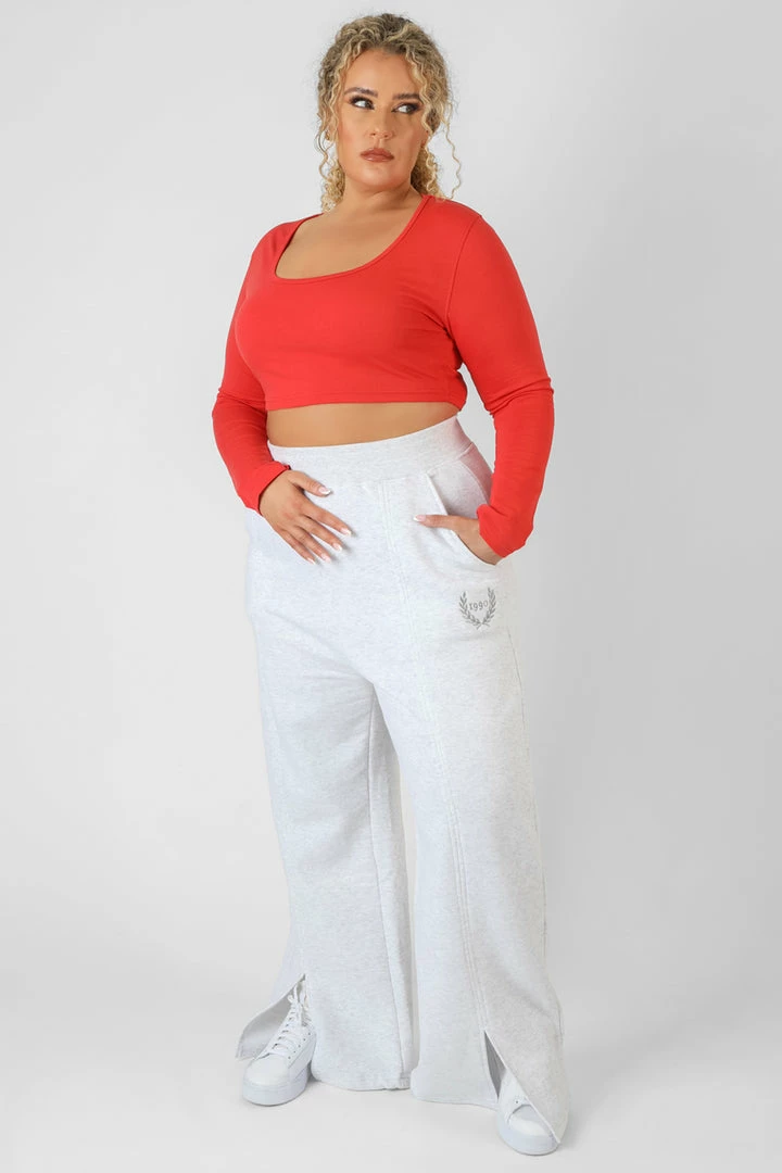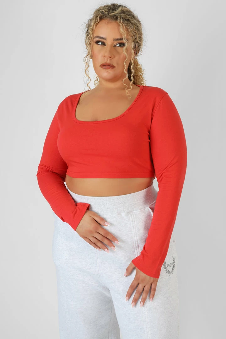 A long sleeve scoop neck crop top in red.