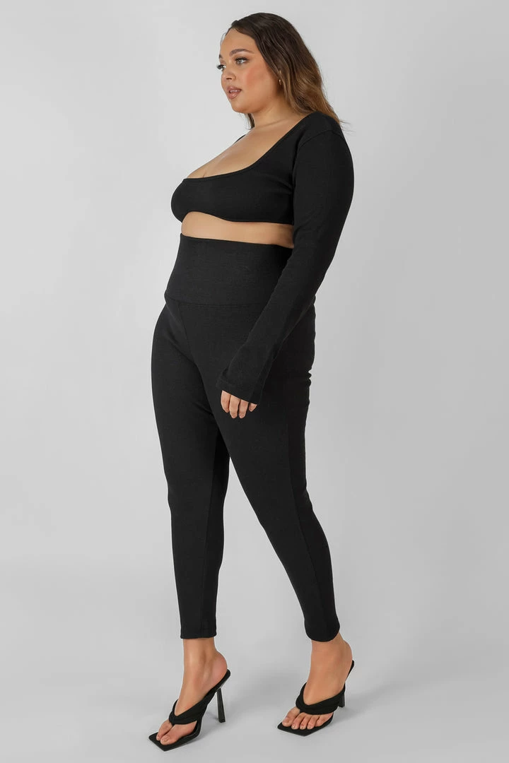 Ribbed black high waisted leggings with a thick waistband.