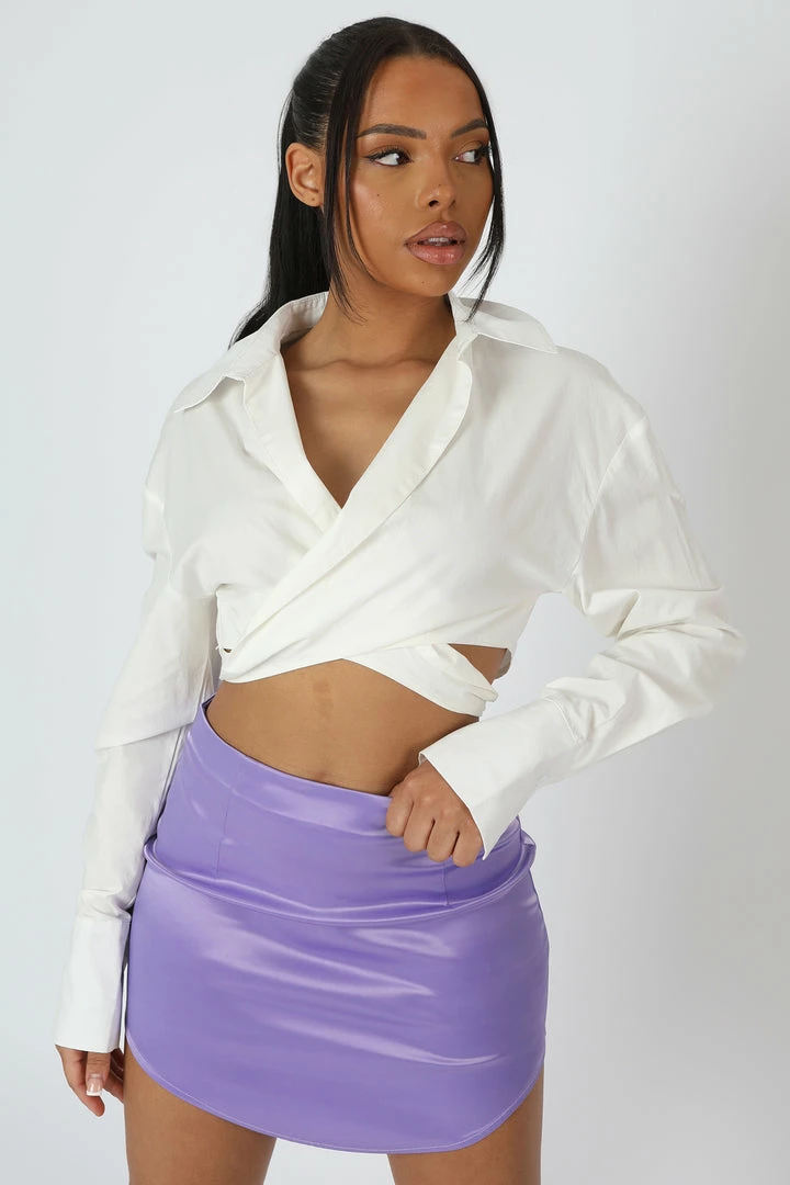 A MINI SKIRT IN BLUEBELL PURPLE VIOLET STRETCH SATIN FEATURING A CURVED HEM