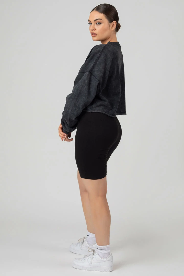 A long sleeve sweatshirt in acid wash with printed detail and a functional zip running from the top to the bottom.