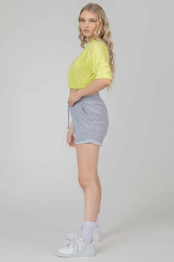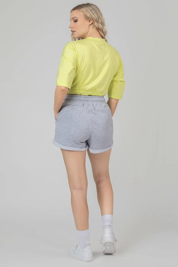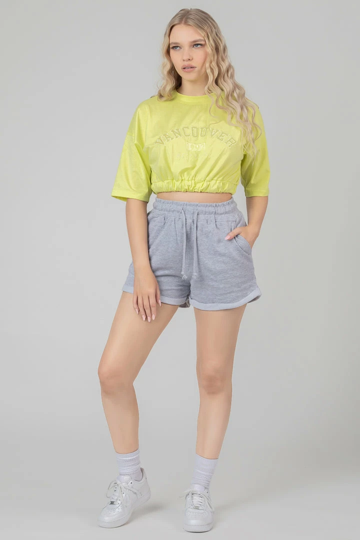 A short sleeve cropped elasticated waist t-shirt in lime with tonal embroidery details.