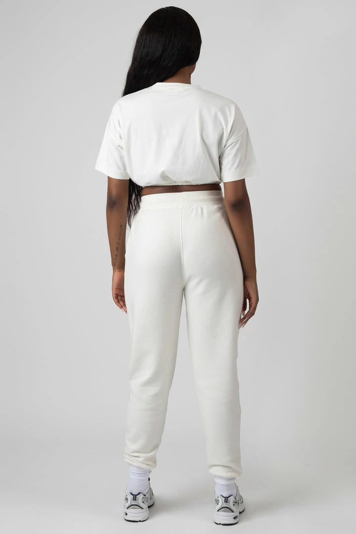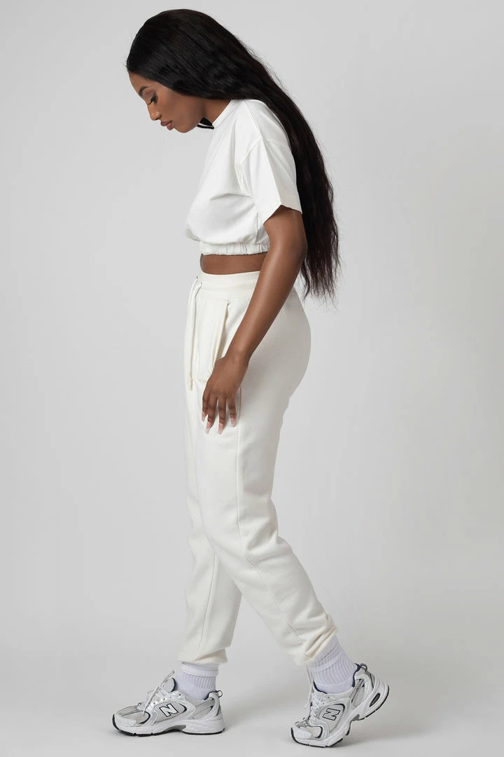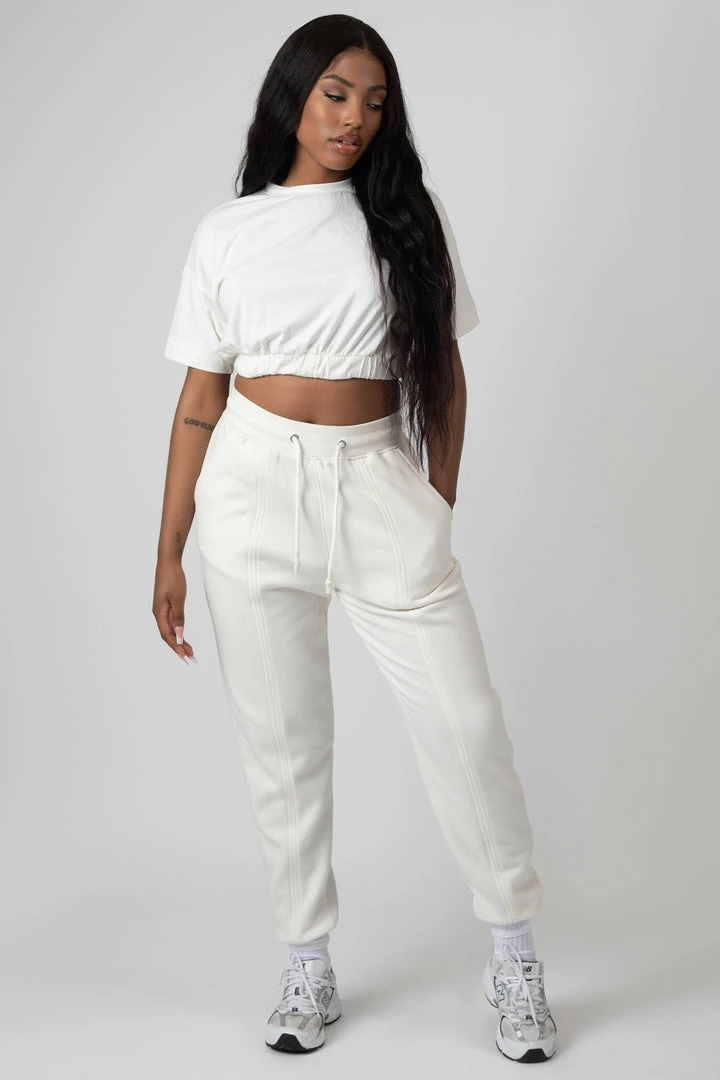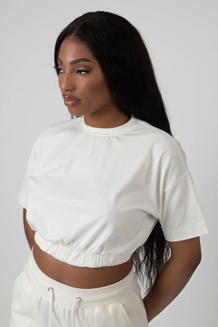 A short sleeve cropped t-shirt with an elasticated waist in white