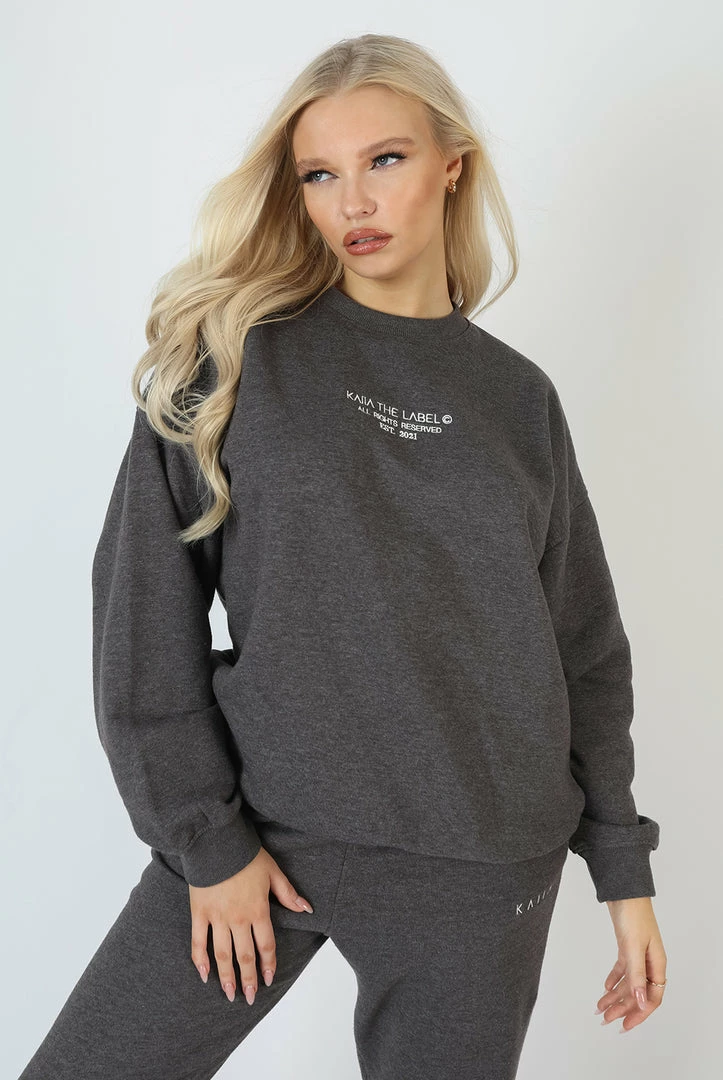 AN OVERSIZED FIT SWEATSHIRT IN CHARCOAL WITH A WASHED EFFECT ON AND KAIIA EMBROIDERED ON IN WHITE