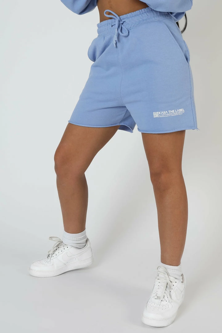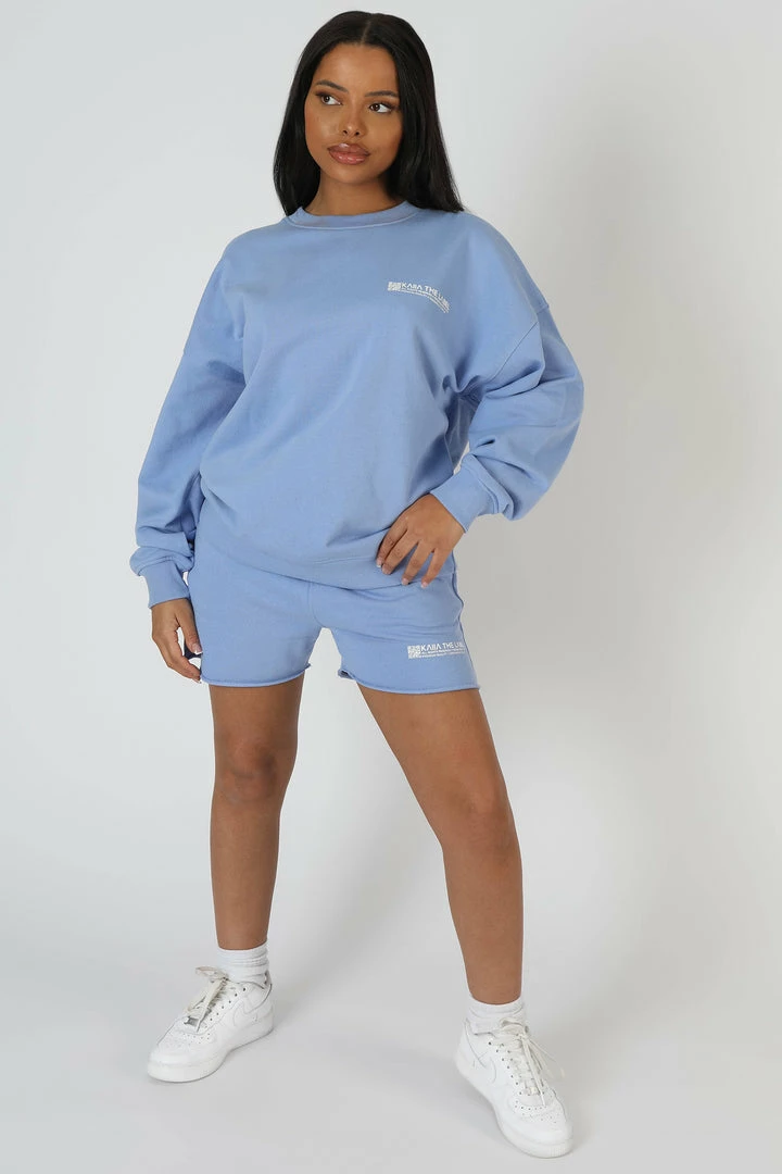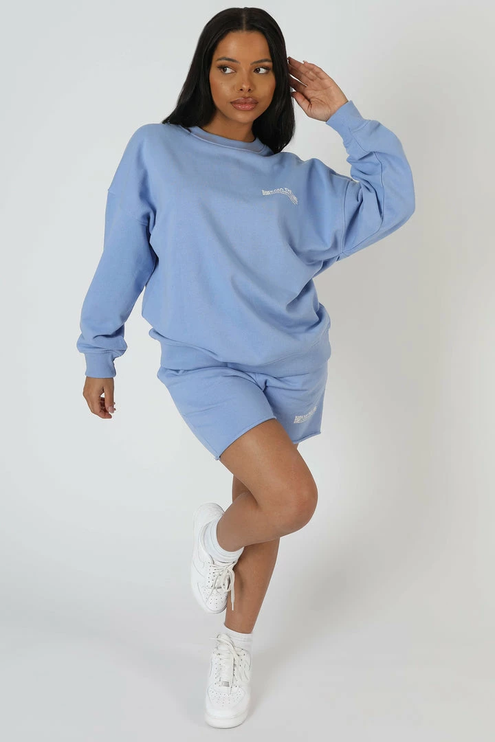 HIGH WAISTED LONG LINE SWEAT SHORTS IN BLUEBELL PURPLE VIOLET WITH A SMALL GRAPHIC