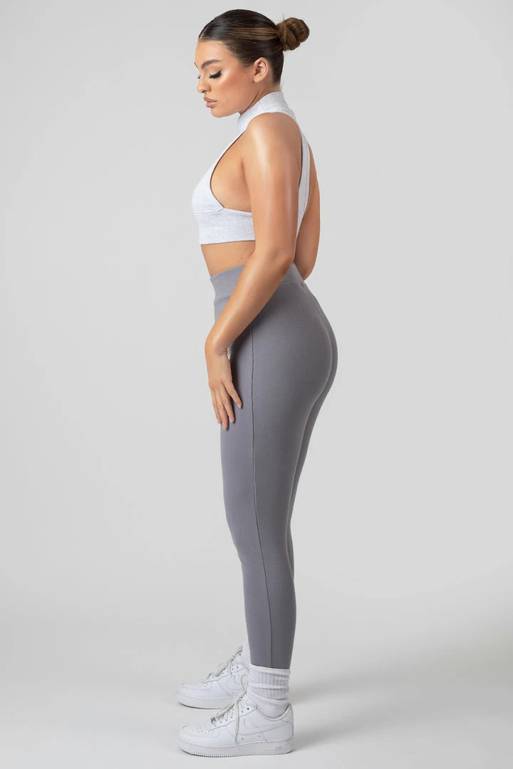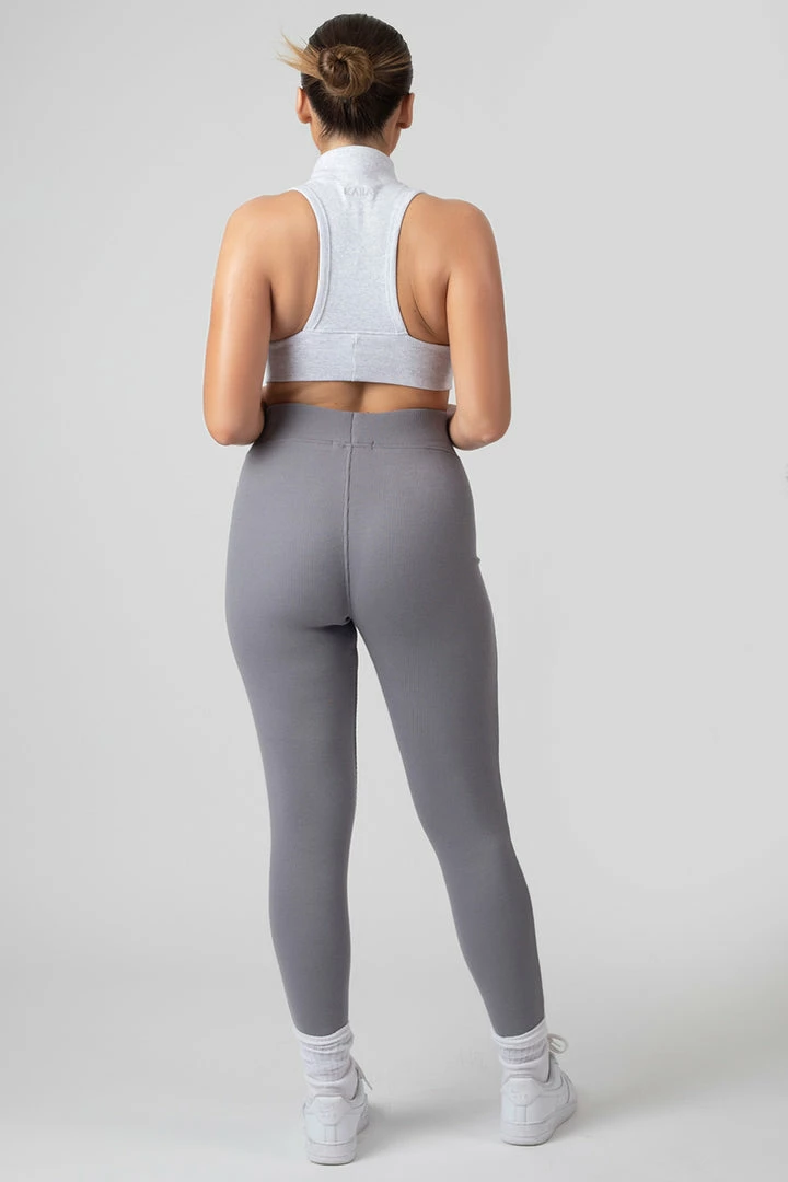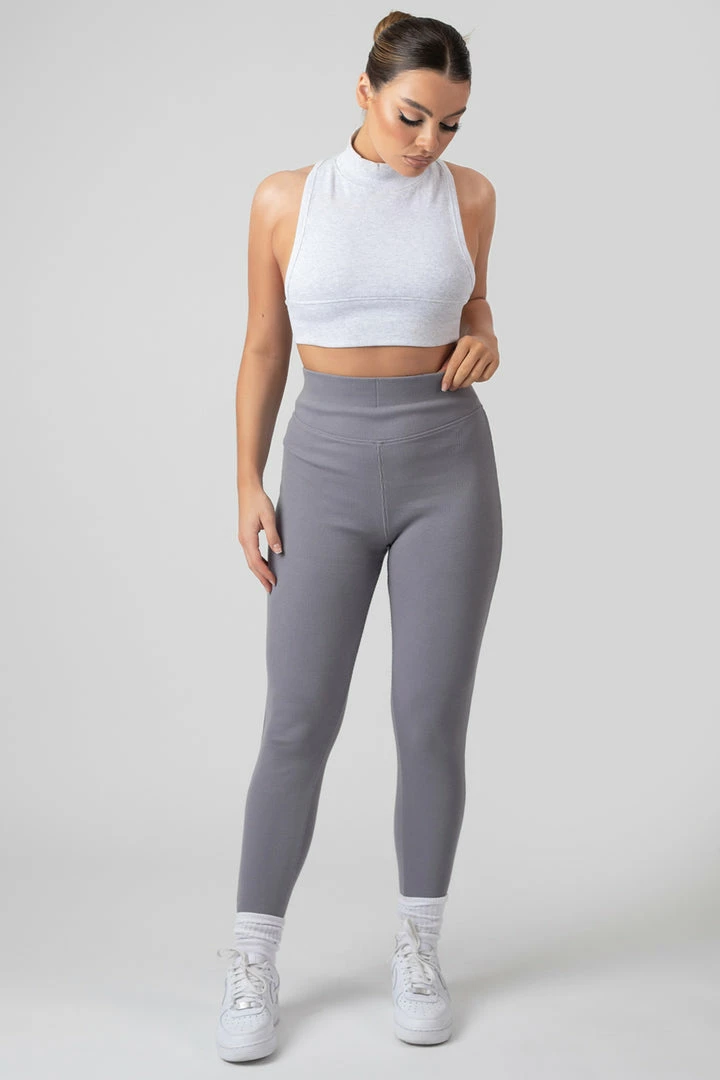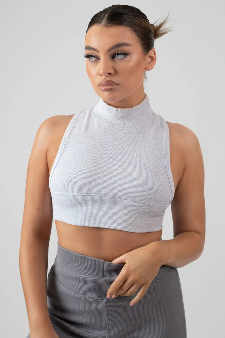 A high neck racer back crop top in oatmeal marl featuring dropped sides made of a flattering thick ribbed material