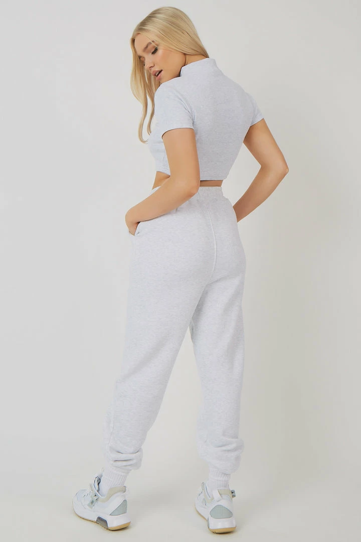 A high neck crop top in oatmeal marl made of a flattering ribbed material with short sleeves.
