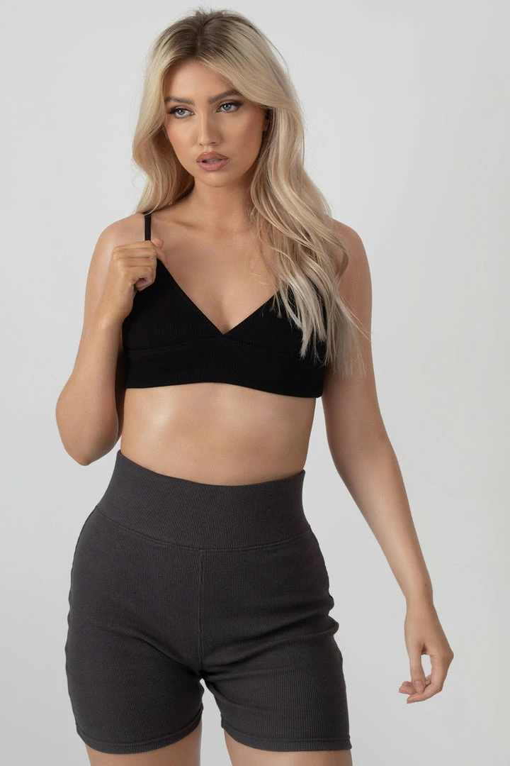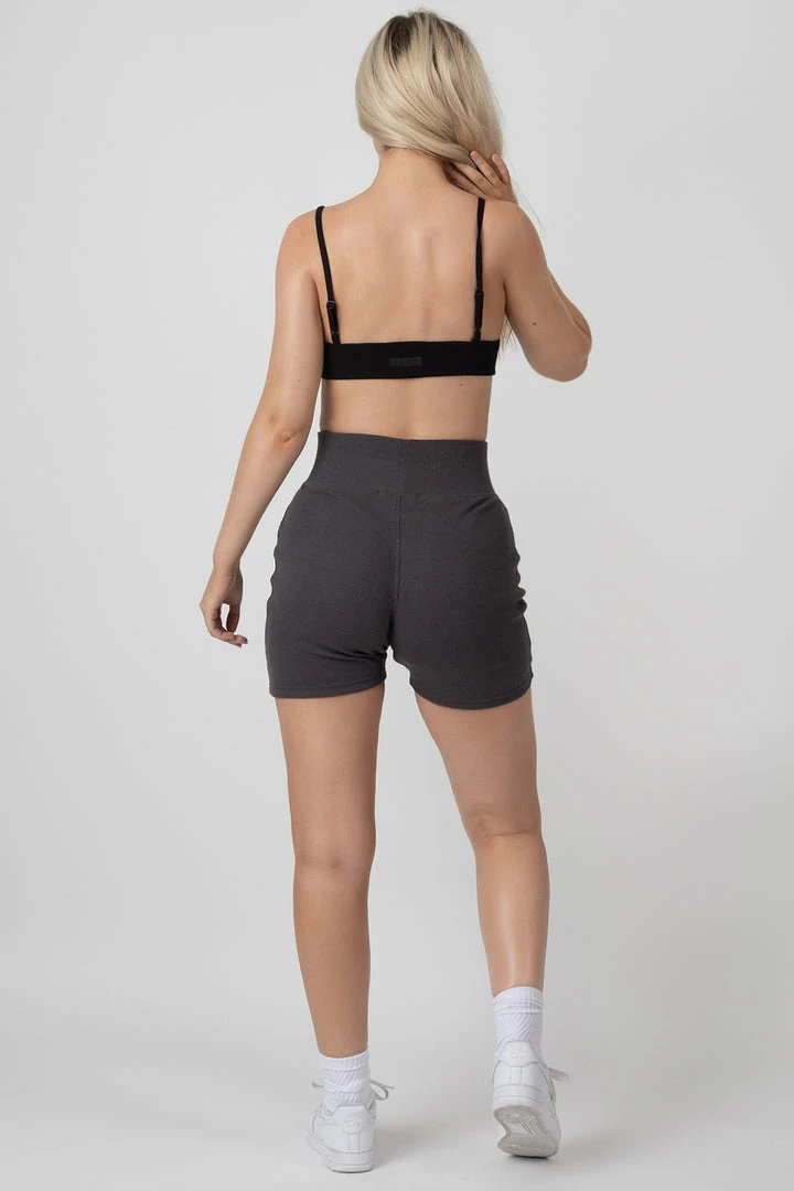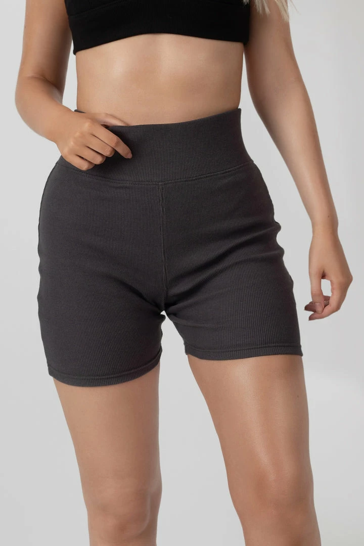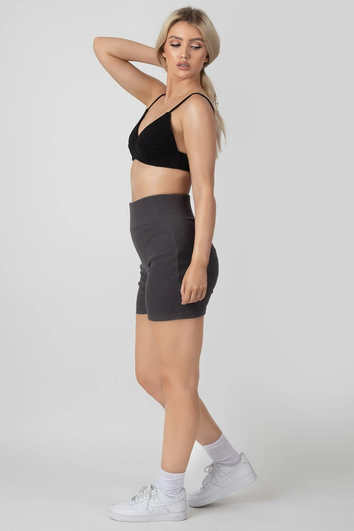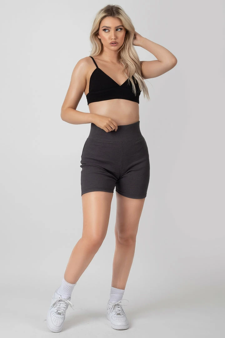 Cycling shorts in dark grey made of a thick ribbed material with a thick waistband in dark grey.