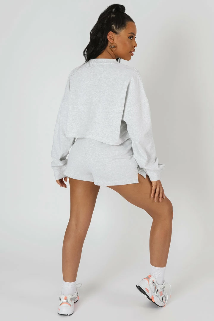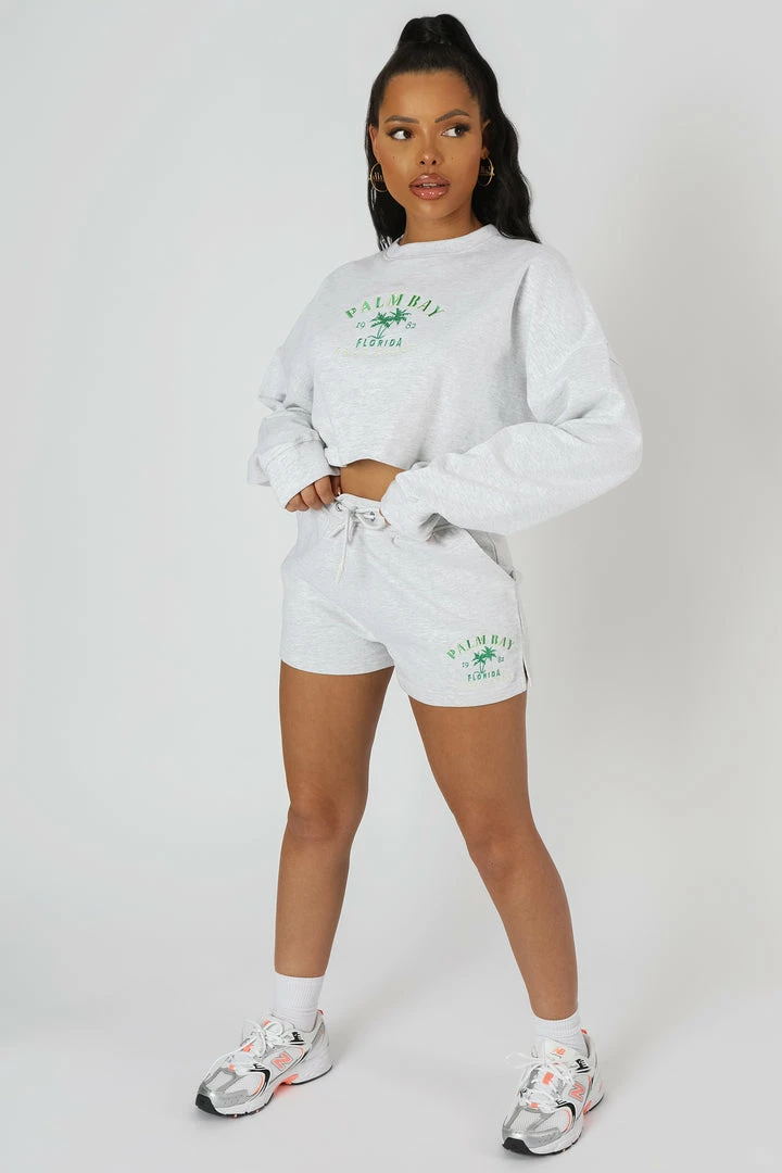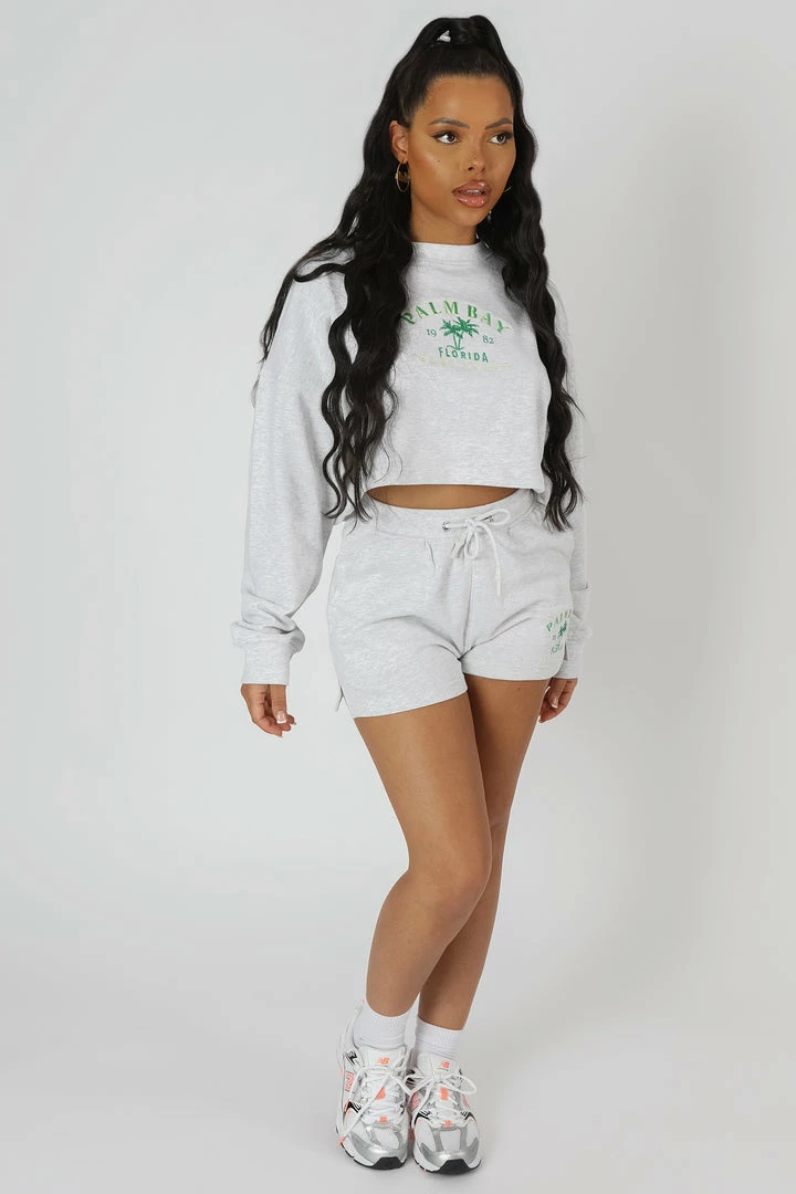 HIGH WAISTED MINI SHORTS IN OATMEAL MARL WITH A PALM BEACH PRINTED ON THEM AND A DRAWSTRING WAIST. PAIR WITH THE CROPPED SLOGAN OVERSIZED SWEATER OATMEAL MARL.
