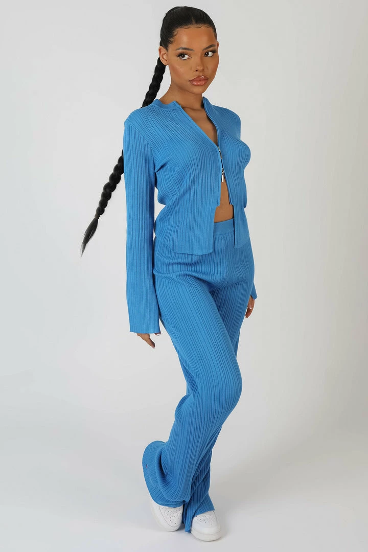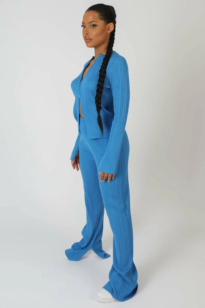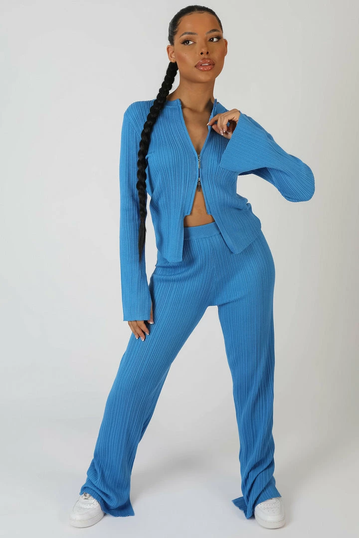 A BLUE KNITTED RIBBED TOP WITH LONG SLEEVES AND A ZIP DOWN THE FRONT
