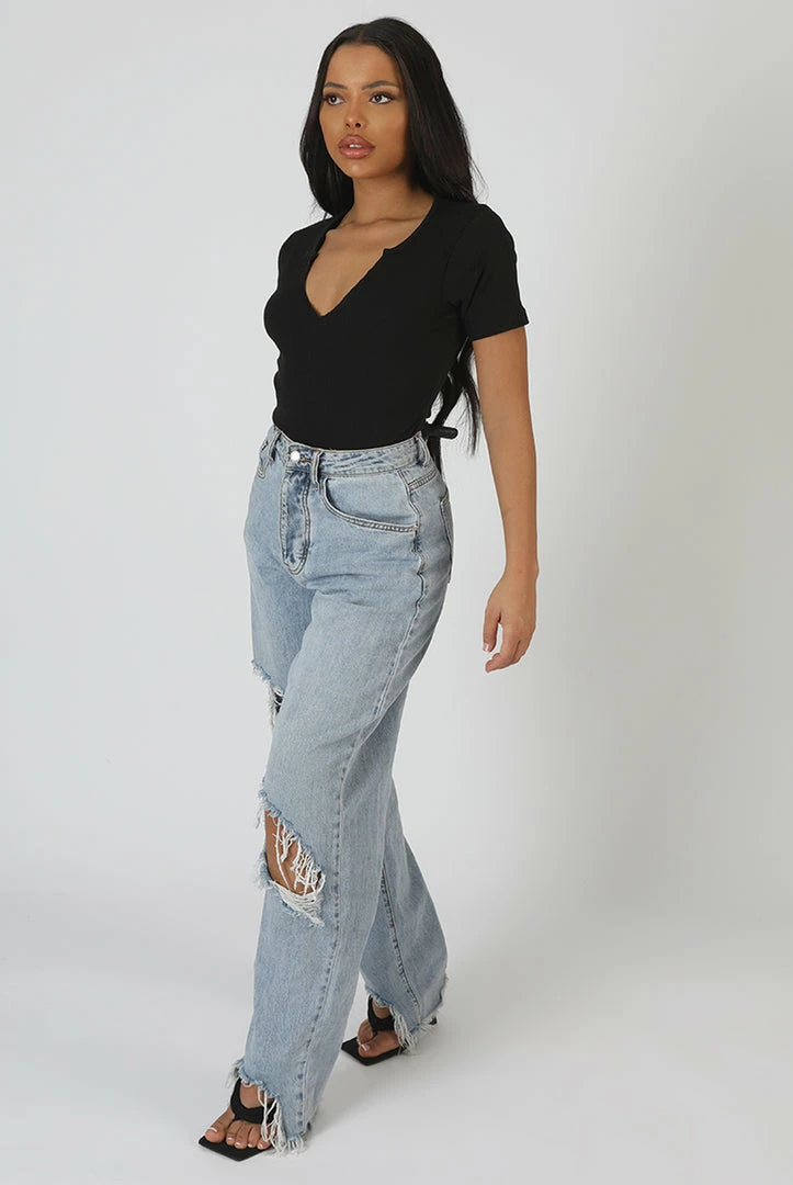 A BODYSUIT IN BLACK WITH A KNOTCH FRONT DETAIL AND SHORT SLEEVES