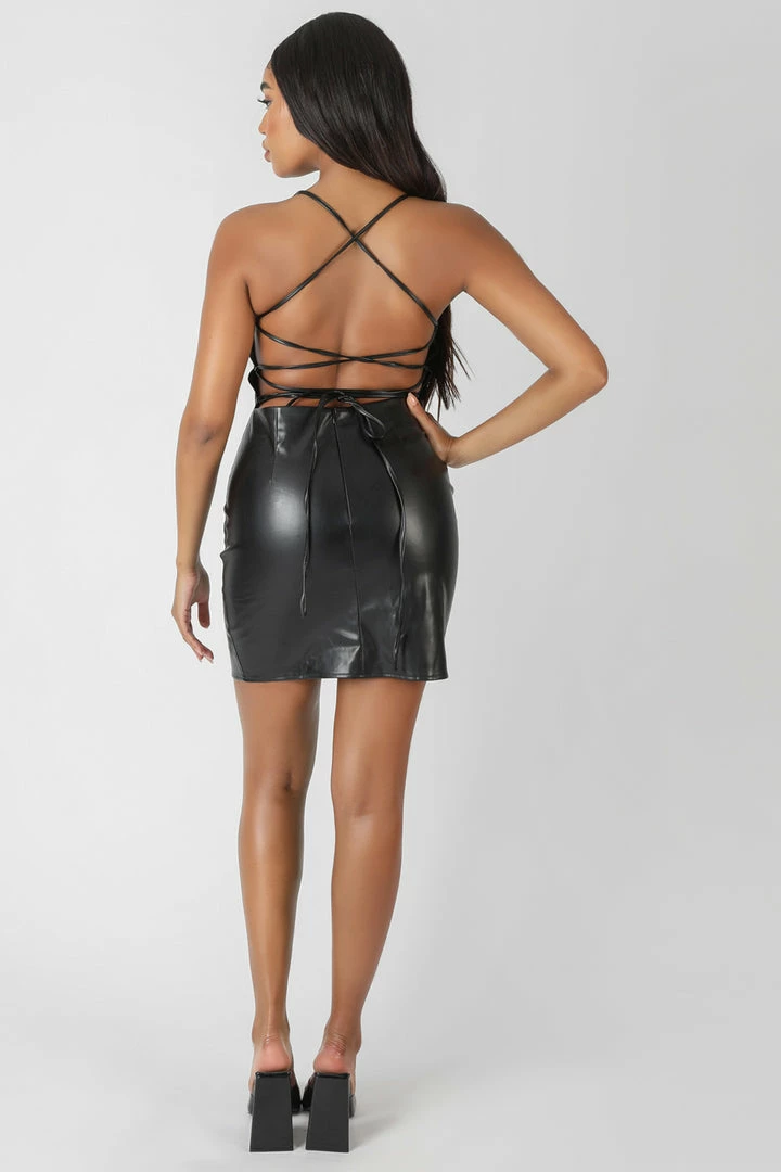 A mini dress in black pu with a split front, lace up back and sqaure neck.