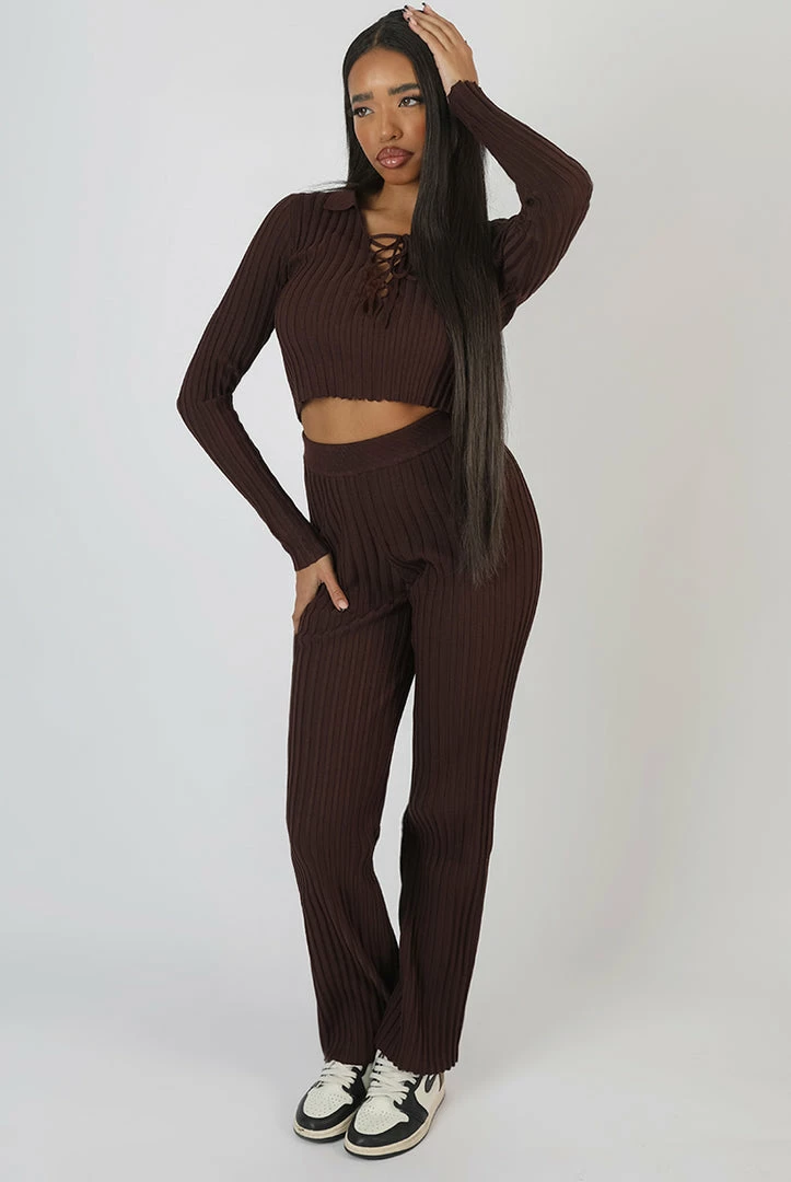 A ribbed knitted long sleeve crop top with a lace up detail on the front in chocolate