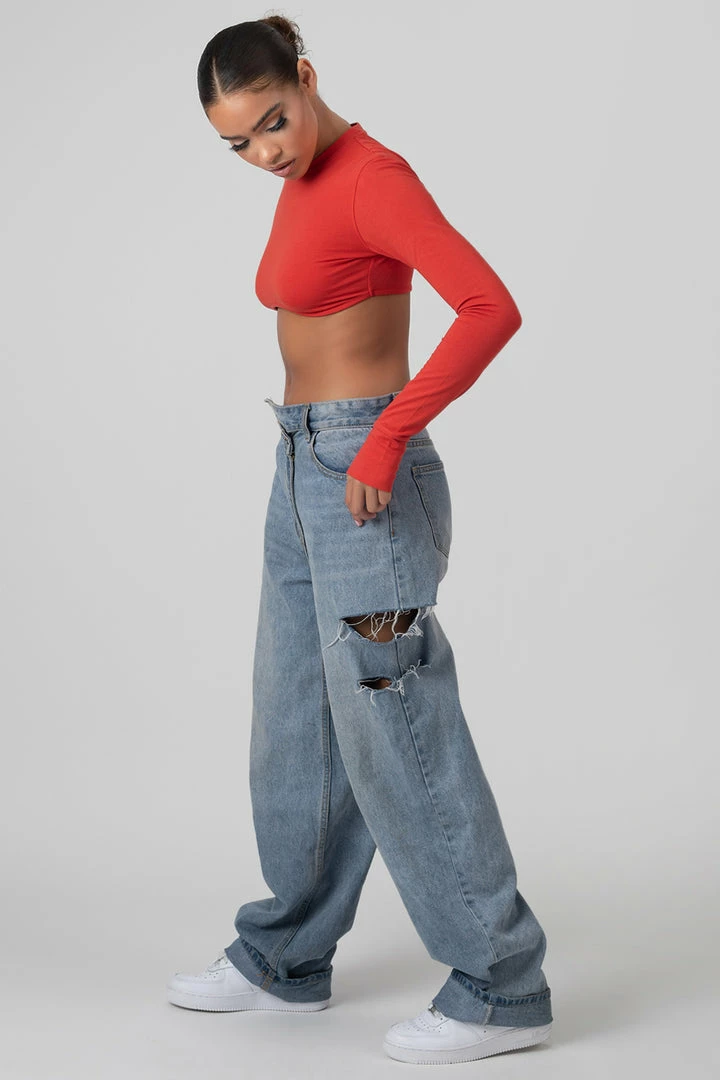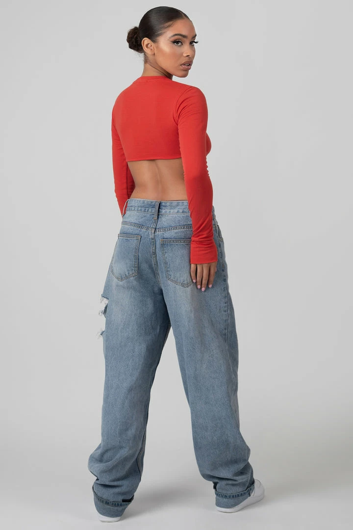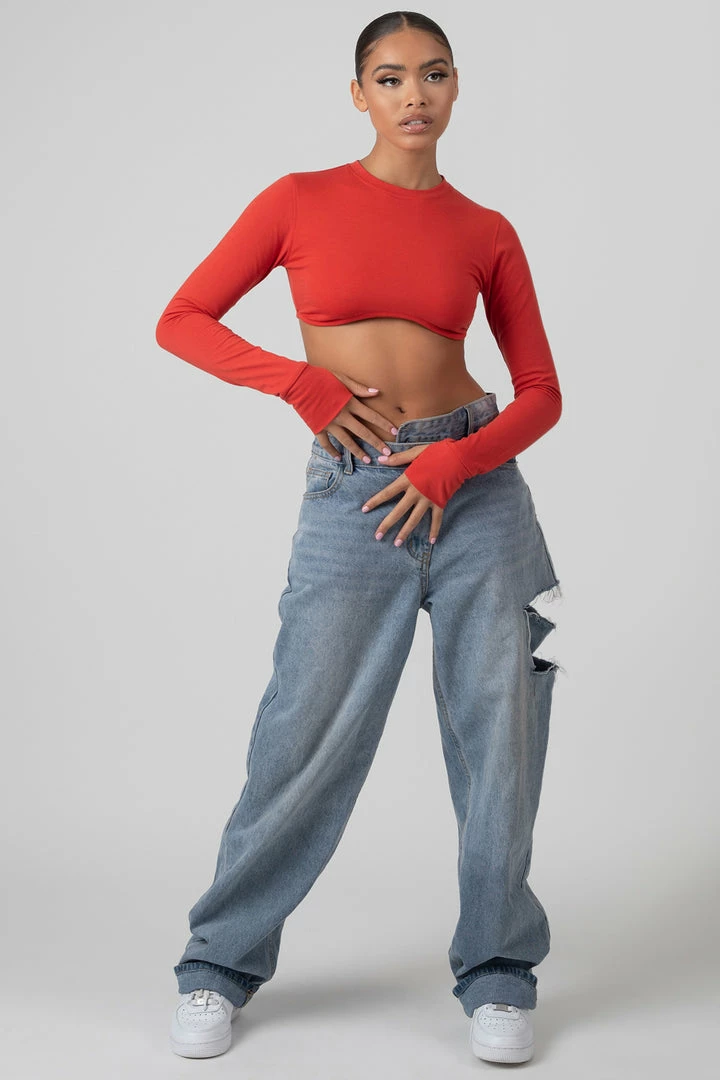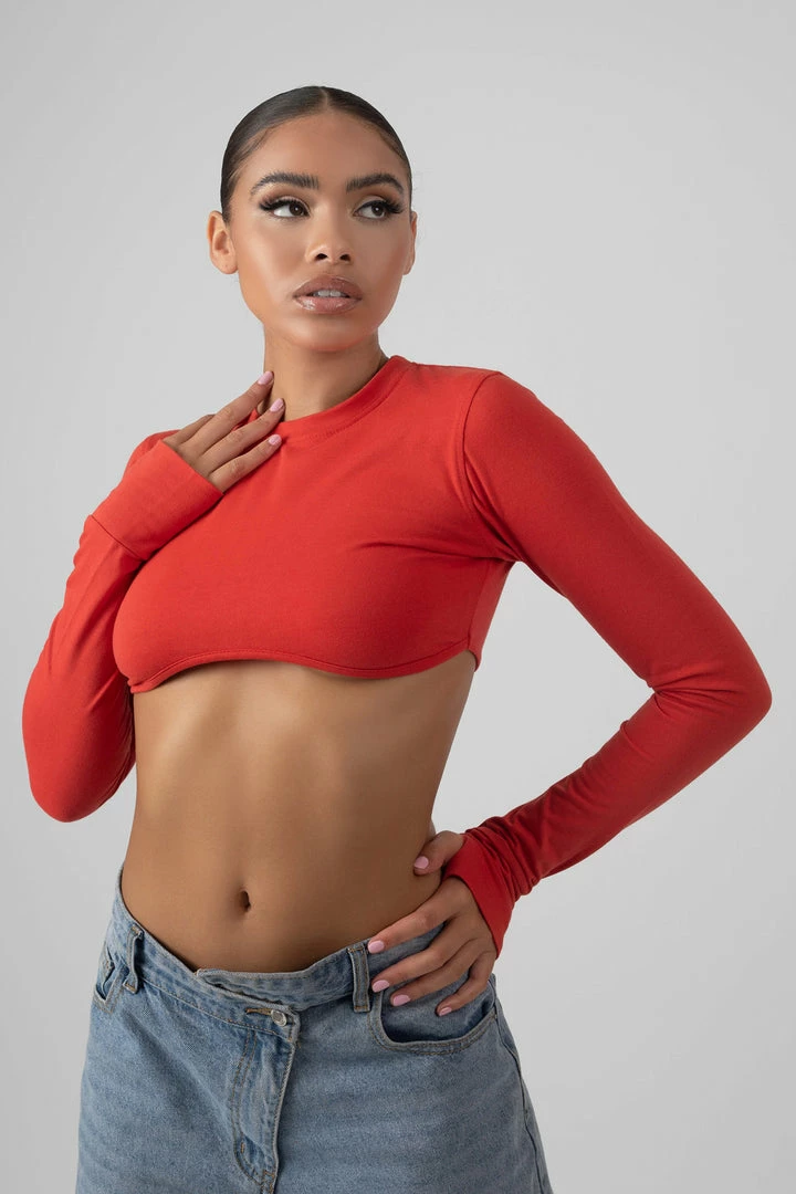 A long sleeve under bust detail super cropped t-shirt in red with thumb hole details.
