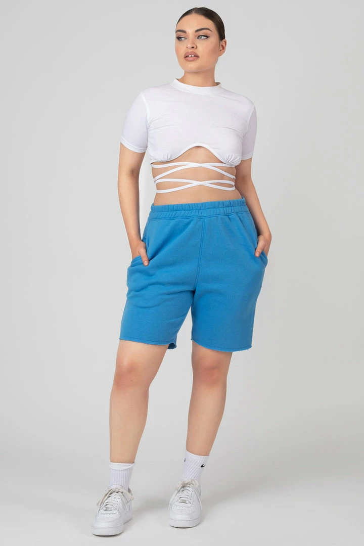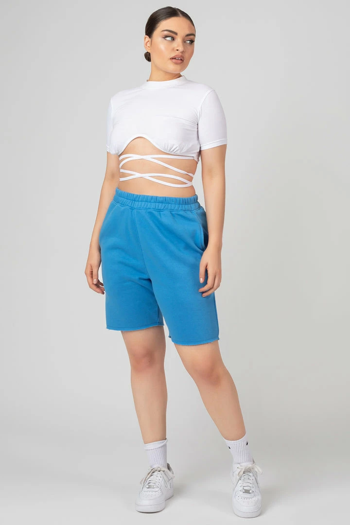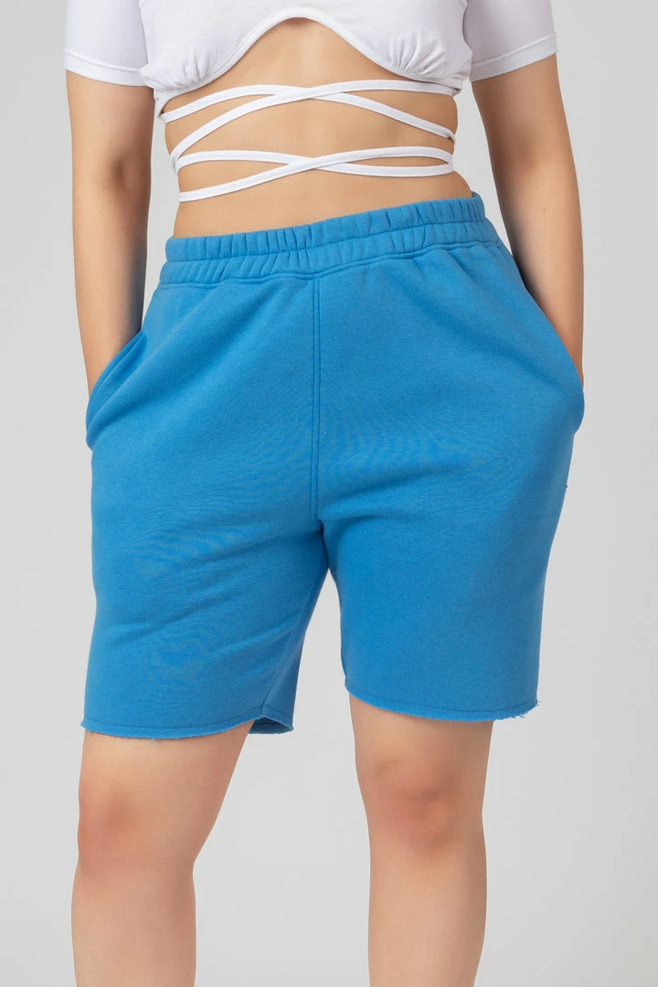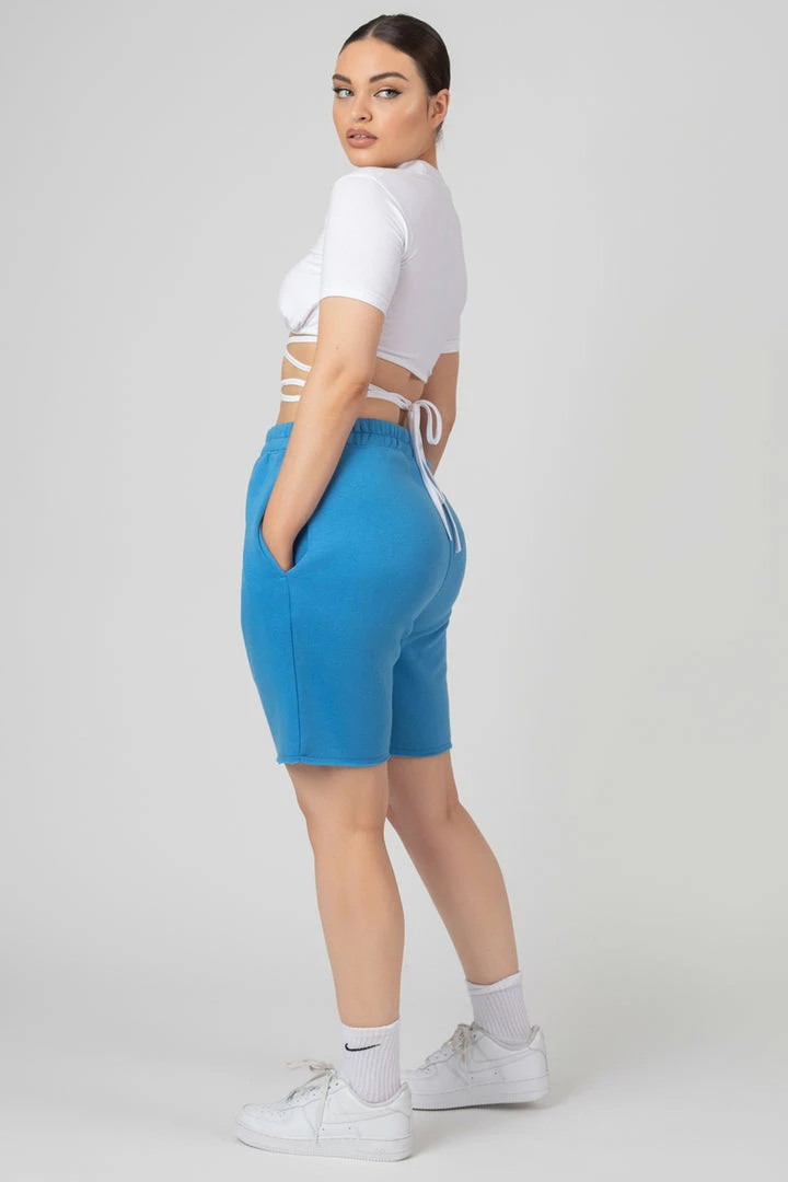 Longline jogger shorts with a raw hem in blue.