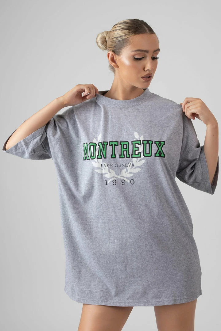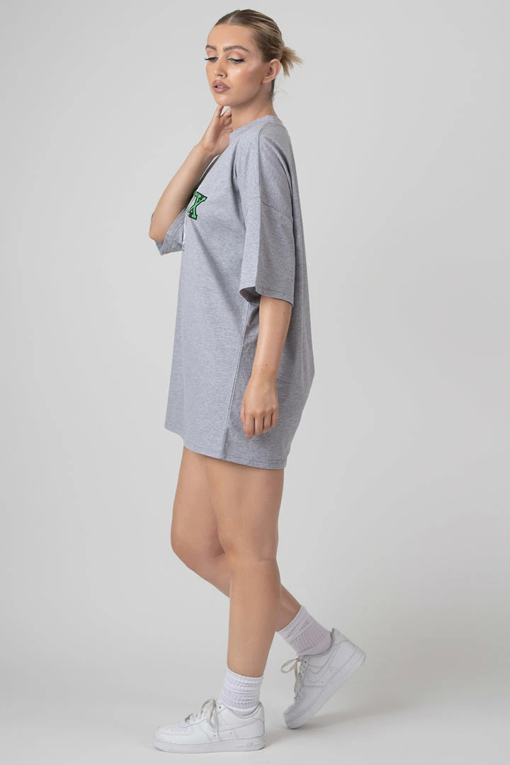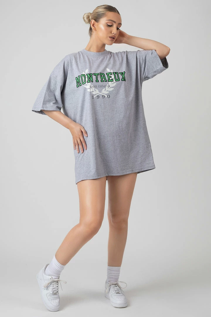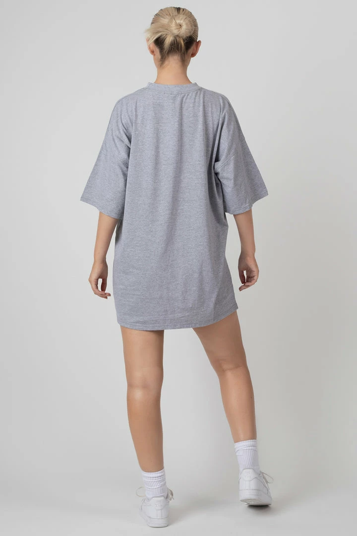 A short sleeve oversized fit t-shirt dress in grey with printed details on the front.