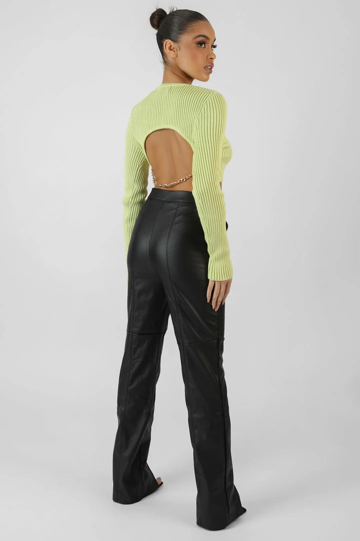 A knitted long sleeve crop top in lime with an open back and chain detail