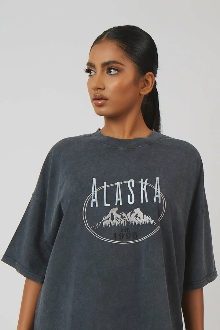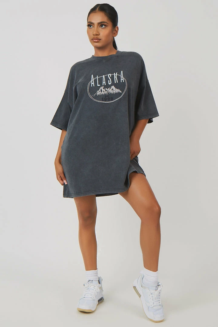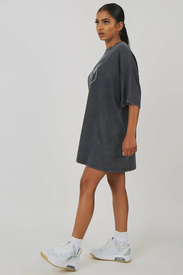 An oversized fit short sleeve t-shirt dress in acid wash with printed detail on the front