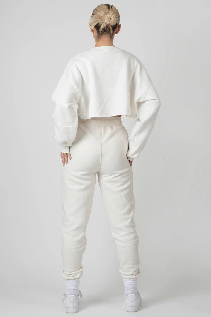 An OVERSIZED extreme cropPED sweatshirt in white with long sleeves and a printed design on the front