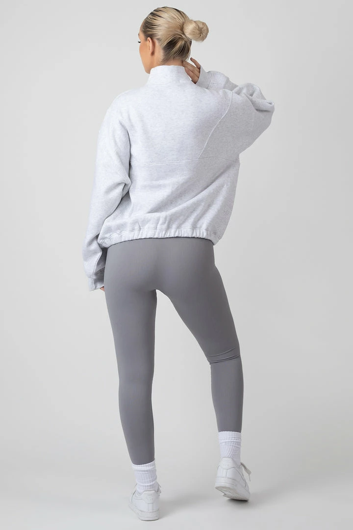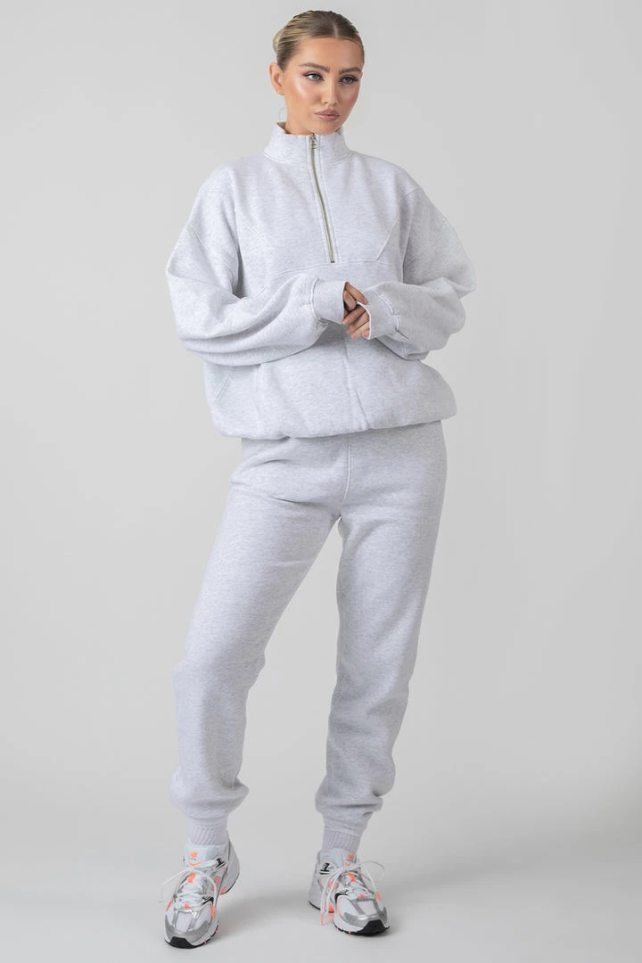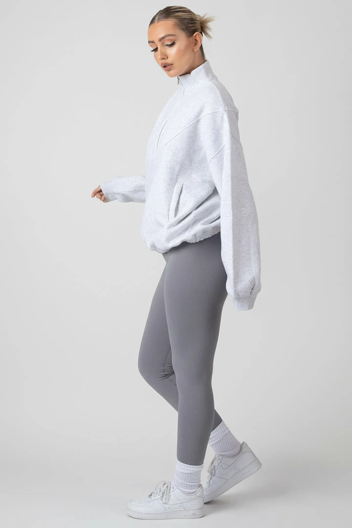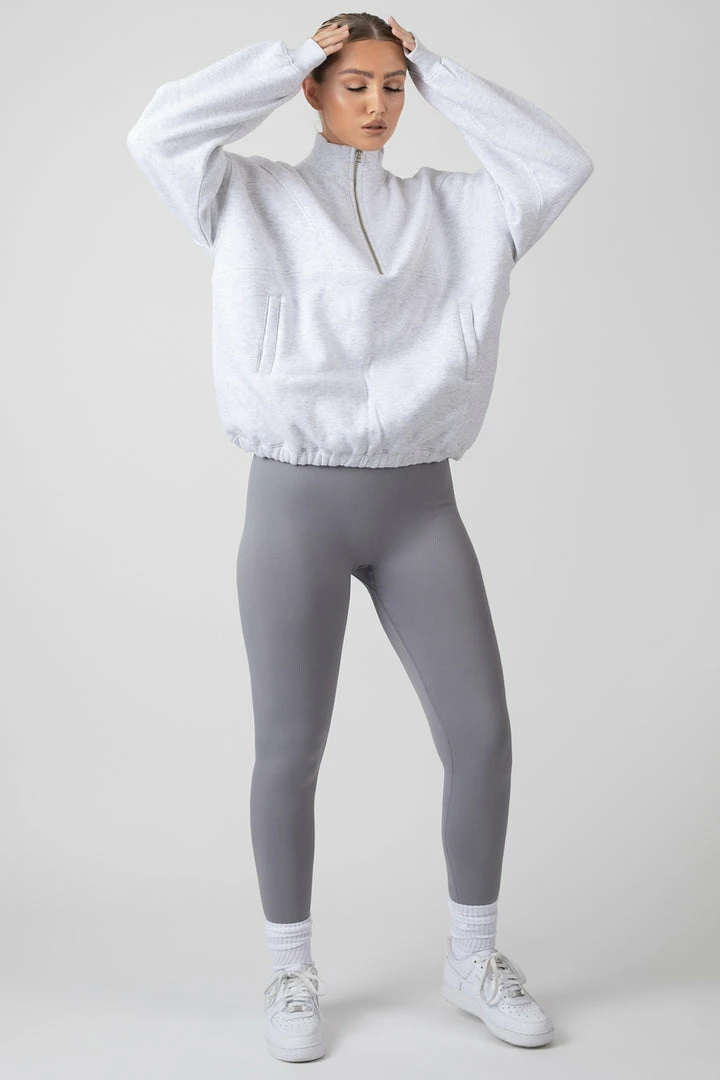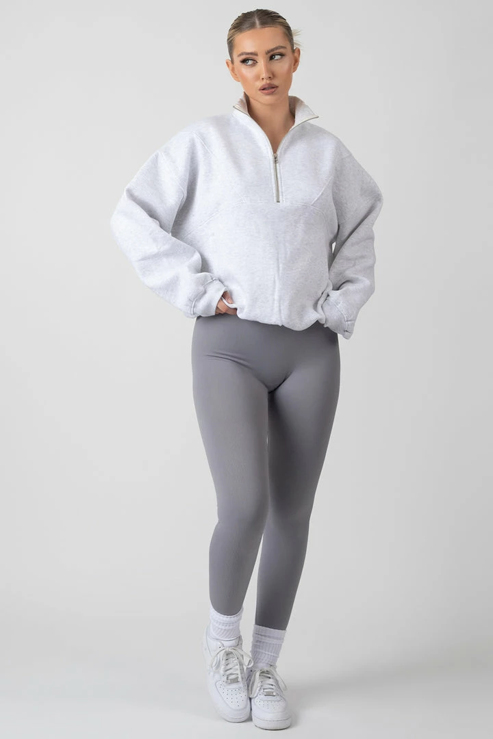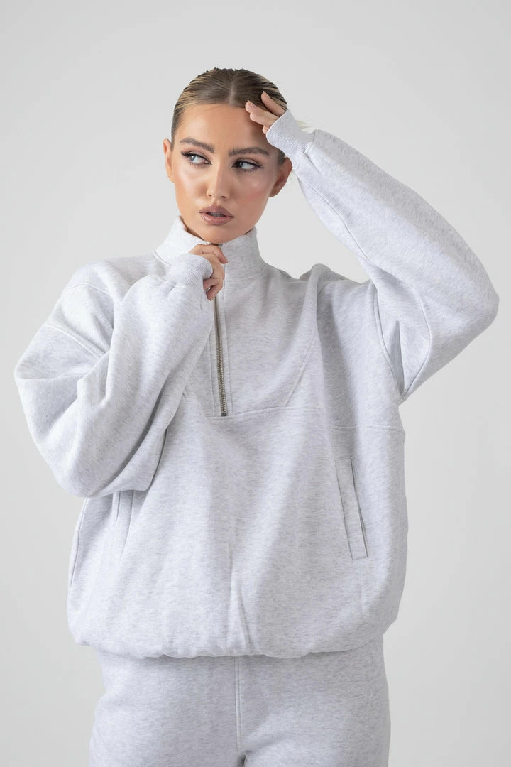 An oversized fit sweatshirt in oatmeal marl featuring a functional half zip and a front pocket