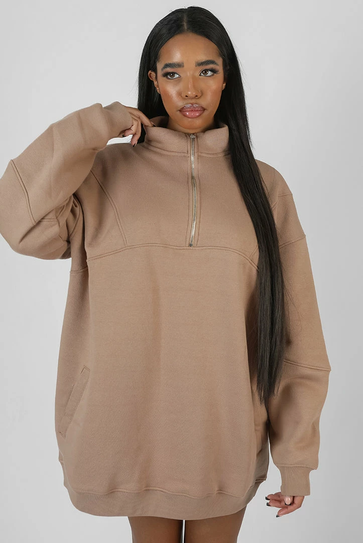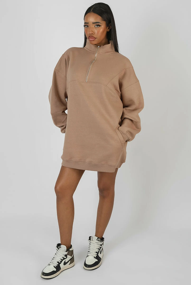 AN OVERSIZED FIT SWEAT DRESS WITH A HALF ZIP IN CAMEL.