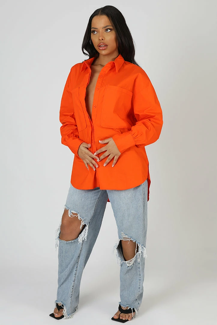 An oversized fit shirt in orange with an oversized pocket on the front.