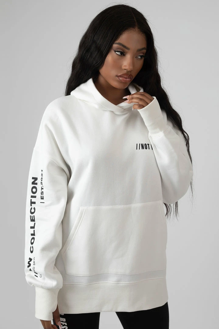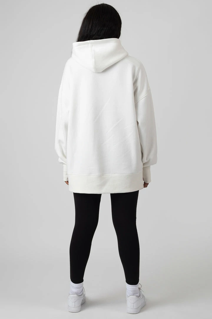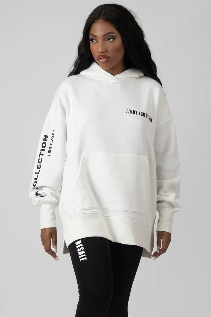 An oversized fit hoodie in white with text detailing.