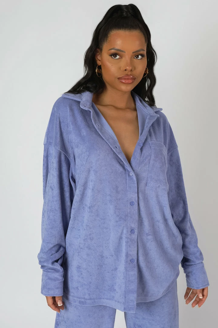 AN OVERSIZED FIT LONG SLEEVE TOWELLING SHIRT IN PURPLE WITH DYE TO MATCH PURPLE BUTTONS AND A FRONT POCKET. PAIR WITH THE TOWELLING WIDE LEG JOGGERS PURPLE FOR THE ULTIMATE SET.