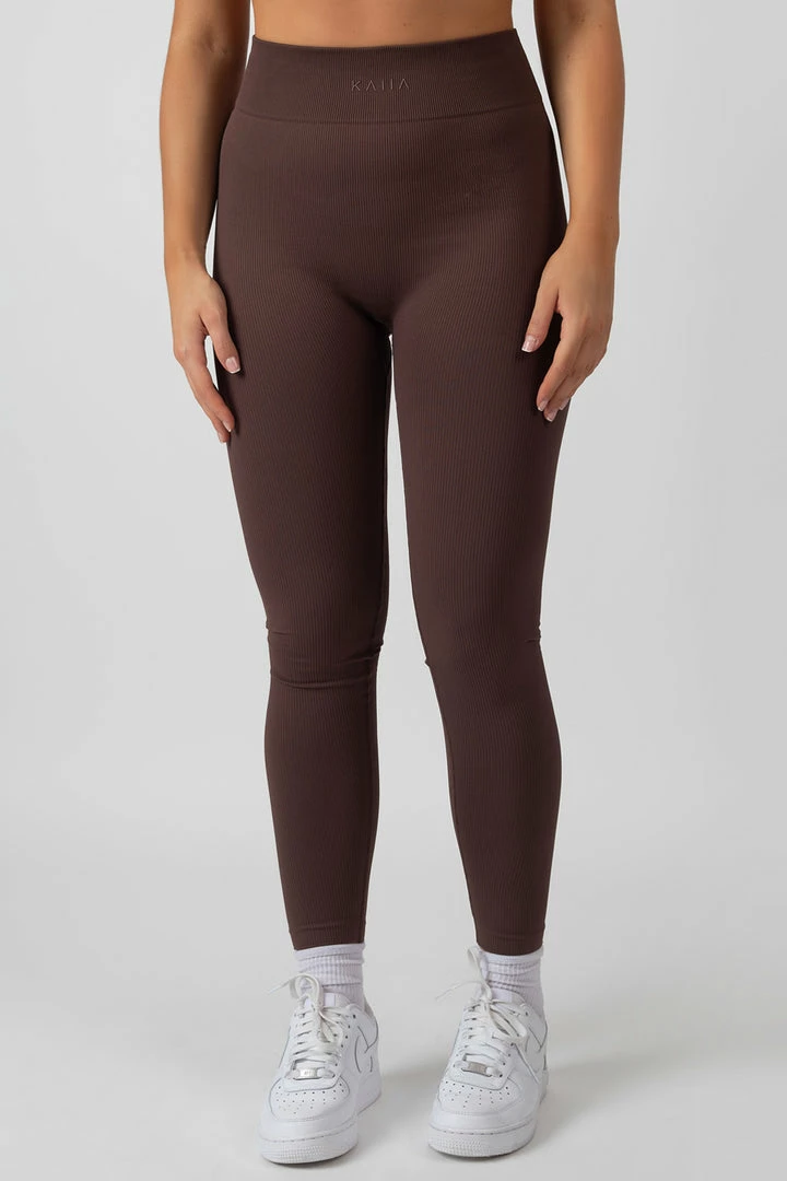 Seamless ribbed leggings in chocolate with our logo detail on the front.