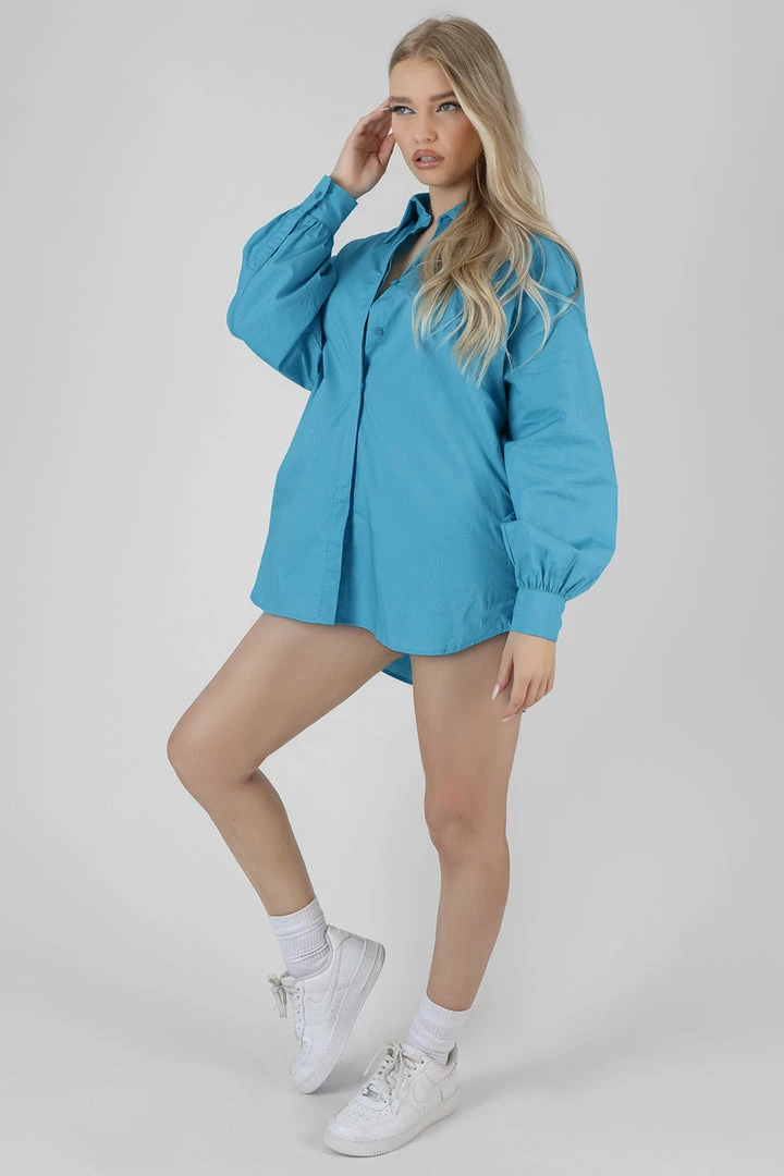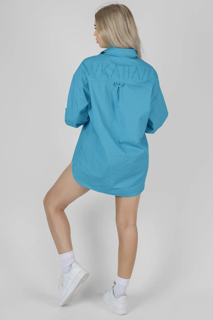 An oversized fit shirt in a blue poplin material with KAIIA printed on the back.