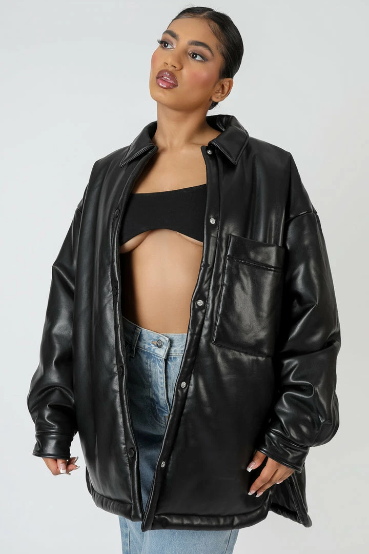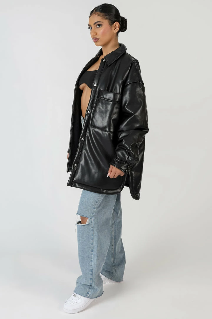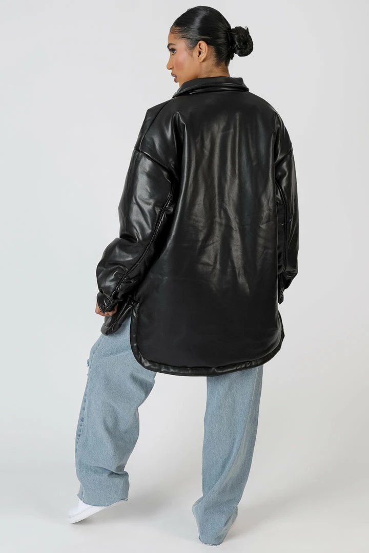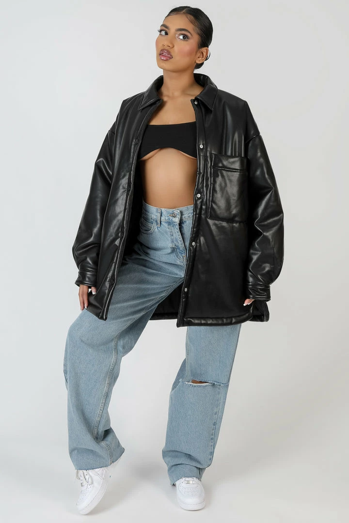 Update your Autumn style with this oversized padded shacket with an oversized fit and in a pu black material.
