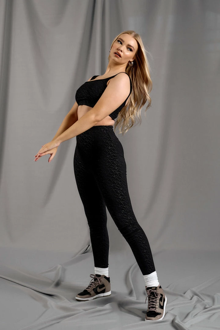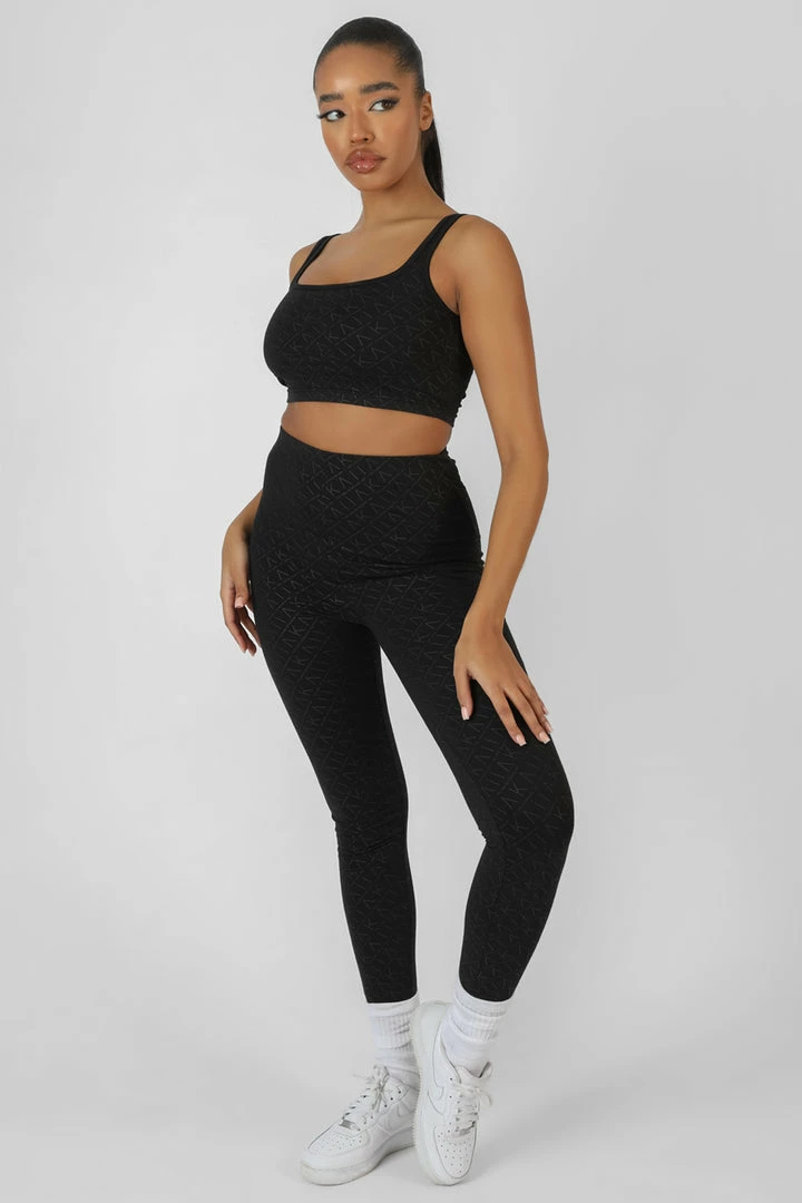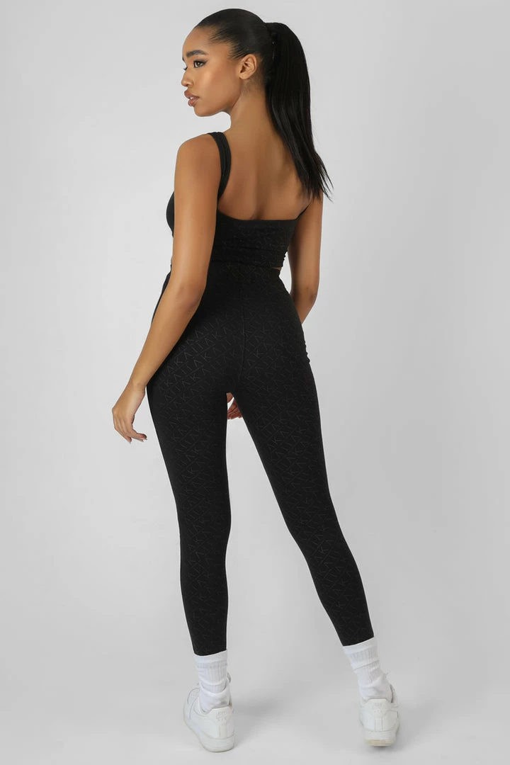 BLACK HIGH WAISTED LEGGINGS WITH A TONAL KAIIA REPEAT PRINT ALL OVER.