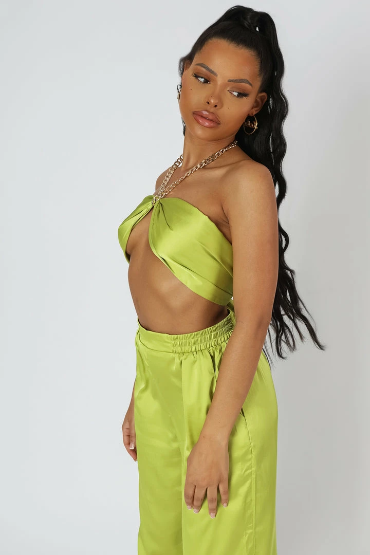 A LIME SATIN BRALET WITH A CHAIN HALTERNECK.