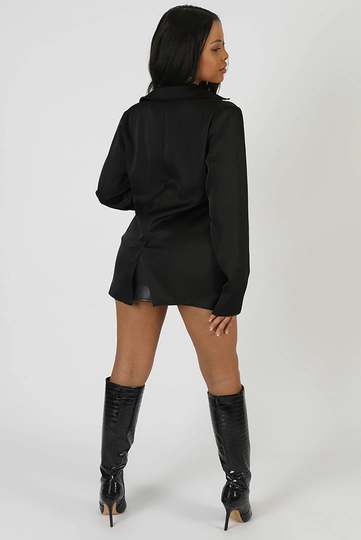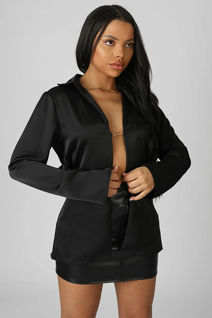 AN OVERSIZED FIT SATIN OPEN FRONT STYLE SHIRT IN A KAIIA PIN DETAIL HOLDING THE SHIRT TOGETHER.