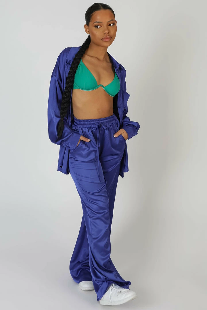 HIGH WAISTED WIDE LEG TROUSERS IN THIS SEASONS HOTTEST COLOUR, PURPLE. FEATURING FRONT POCKETS AND A DRAWSTRING WAIST. PAIR WITH THE OVERSIZED SATIN SHIRT IN PURPLE FOR THE ULTIMATE SET.