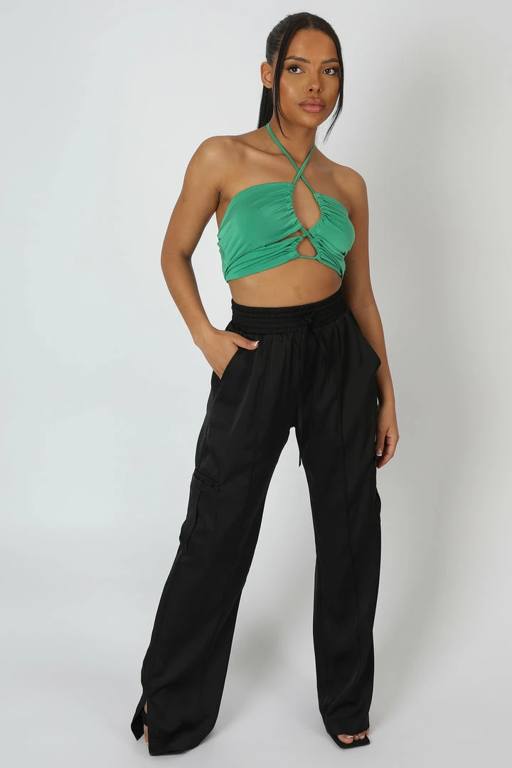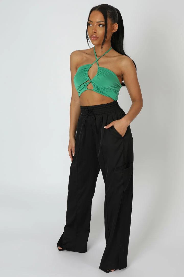 This season we are loving green and this crop top is a must. Featuring a slinky green material with flattering ruching, cut outs and a strappy cropped design.