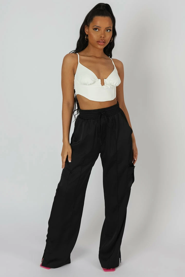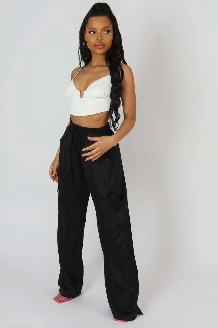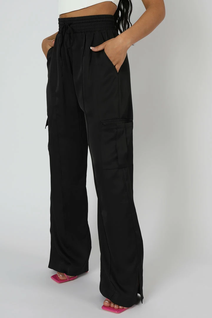 OUR ICONIC HIGH WAISTED ELASTICATED WAIST SPLIT HEM CARGOS NOW IN A BLACK SATIN.