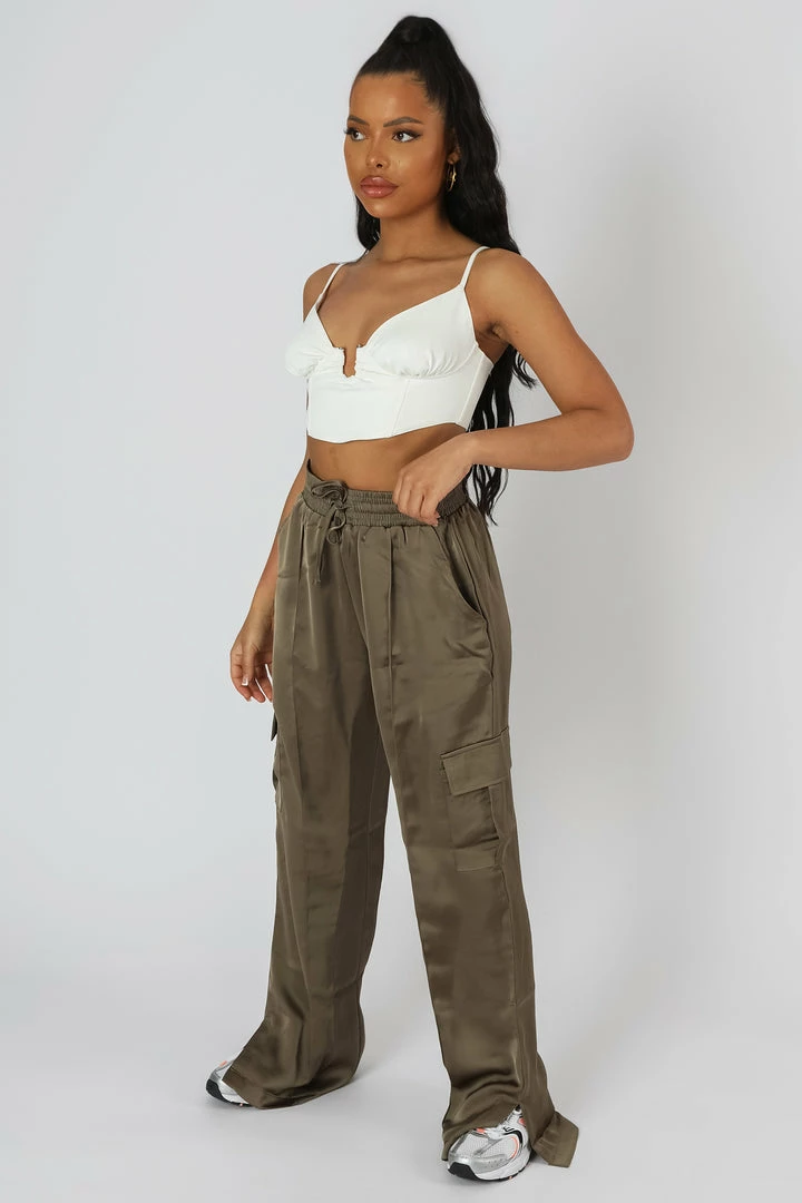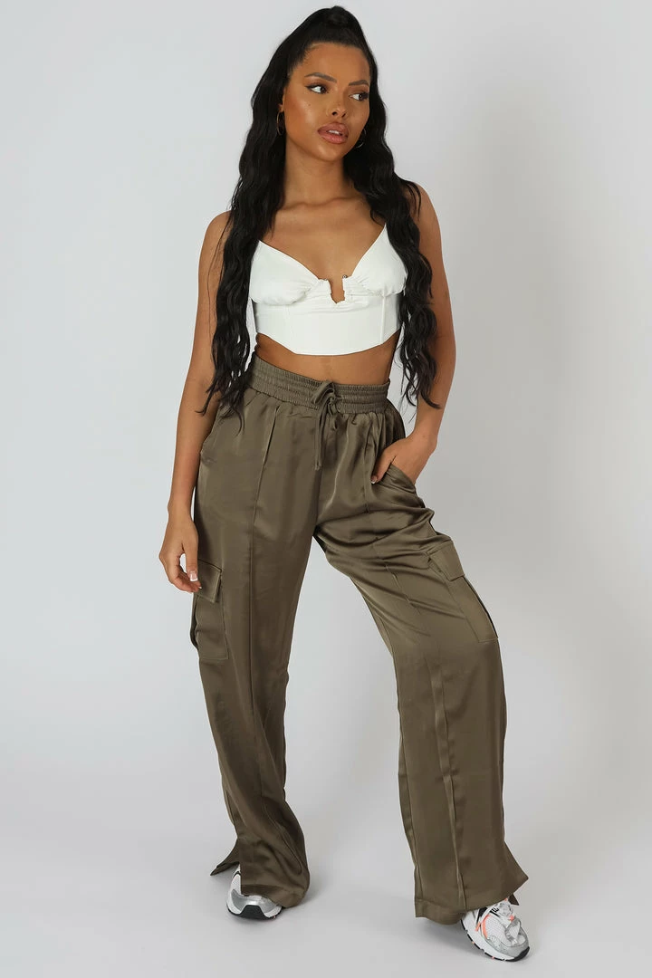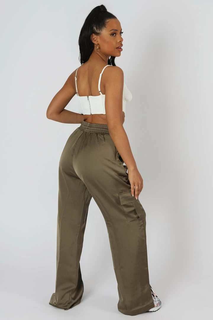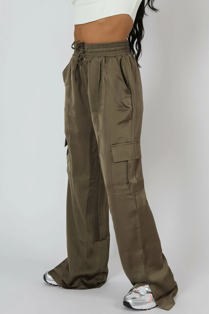OUR ICONIC HIGH WAISTED ELASTICATED WAIST SPLIT HEM CARGOS NOW IN A SATIN KHAKI