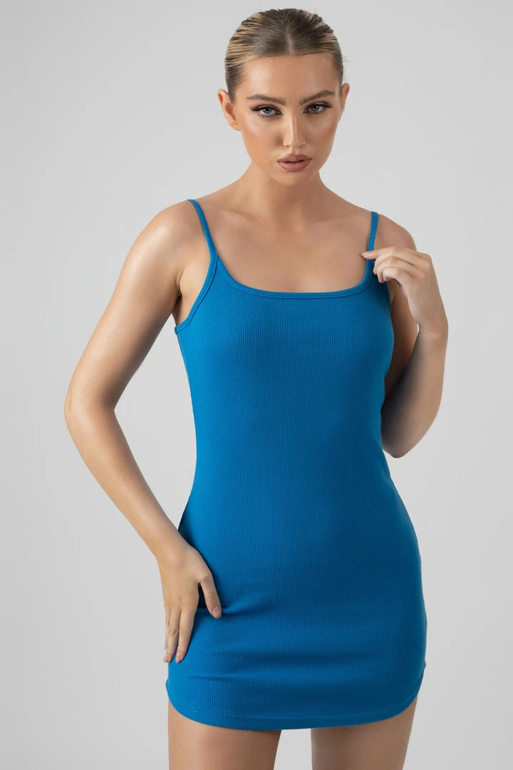 A bodycon mini dress with thin straps and a flattering curved hem in blue