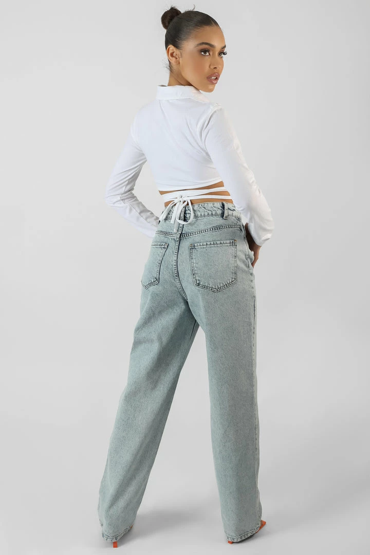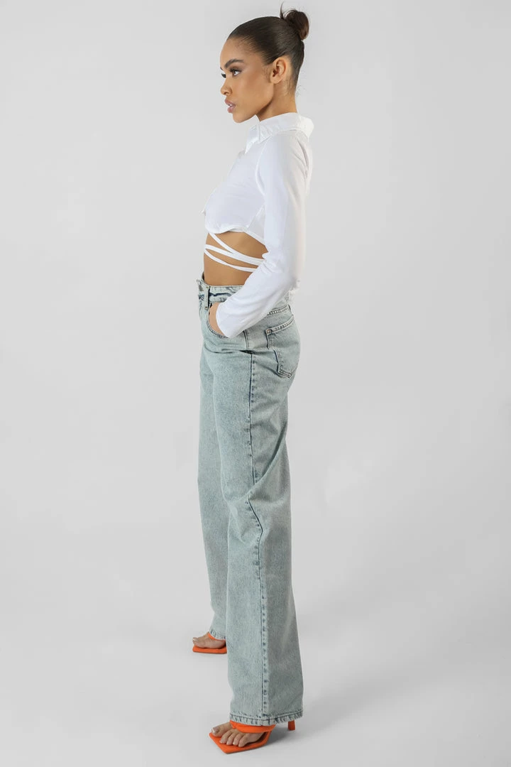 A cropped polo style top in white with button fastenings and a collar featuring a waist strapping detail