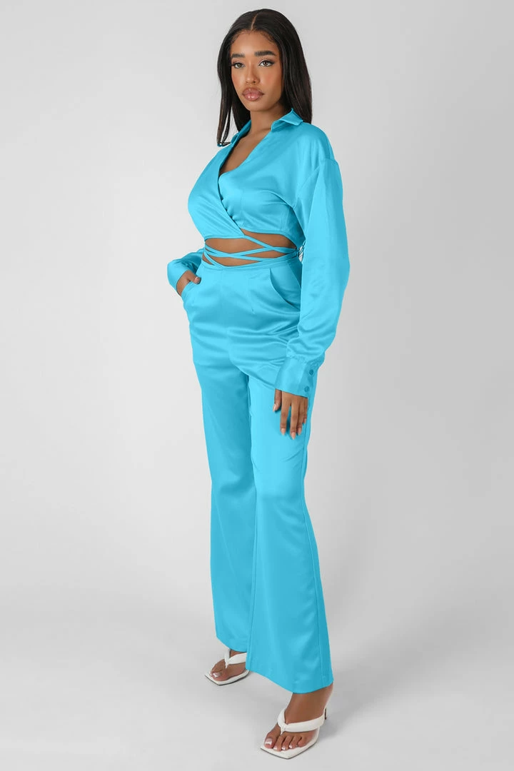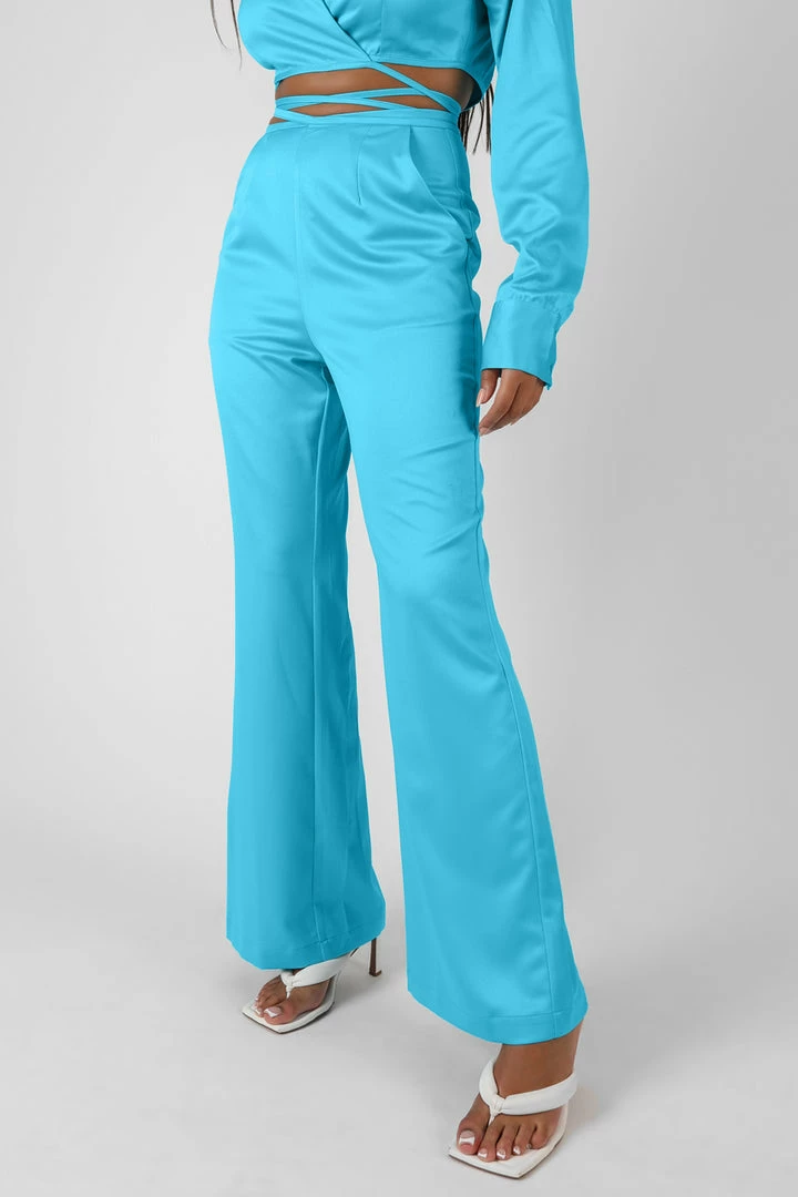 High waisted straight leg trousers in blue satin with a strappy waist detail.