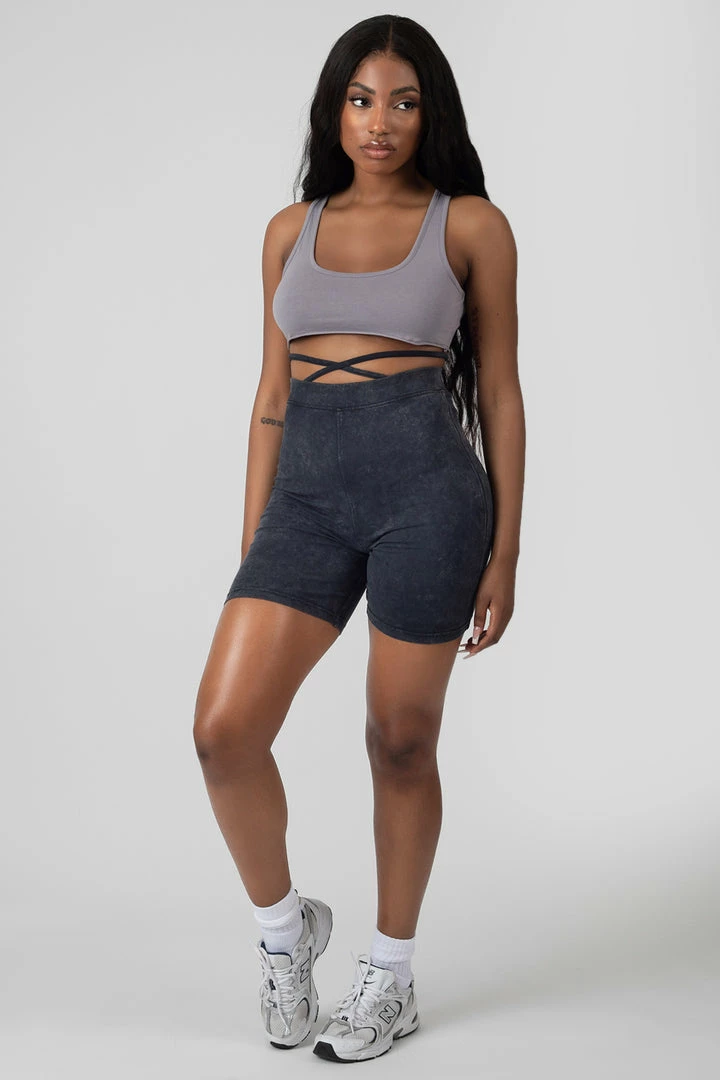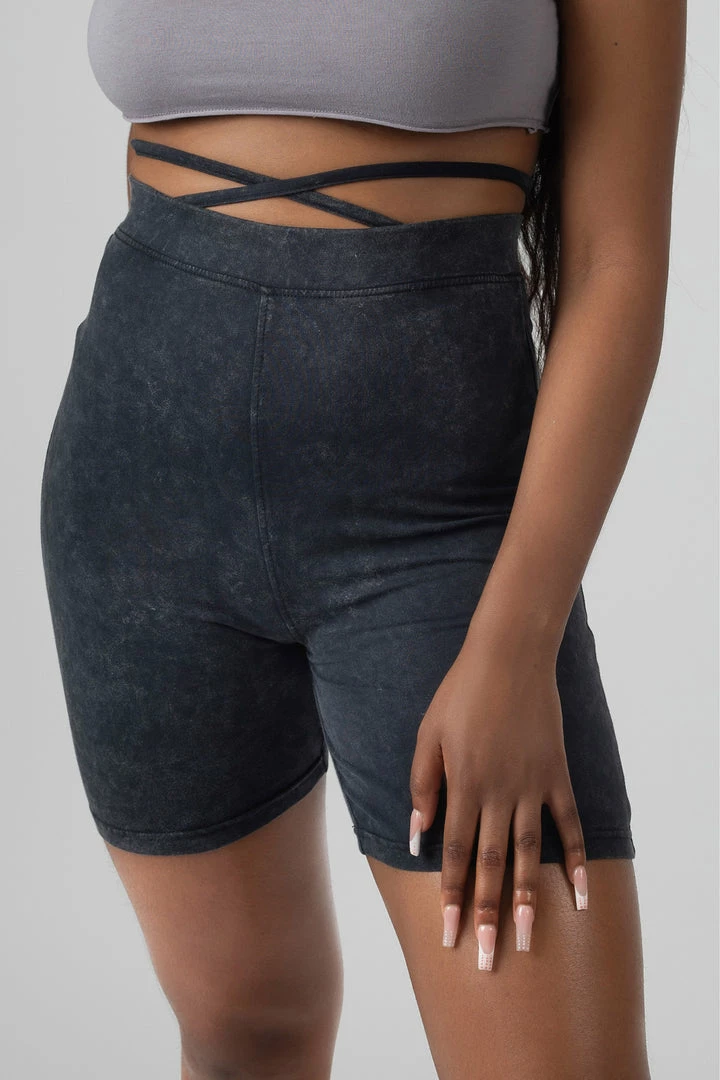 High waisted cycling shorts in acid wash featuring a strap tie waist detail