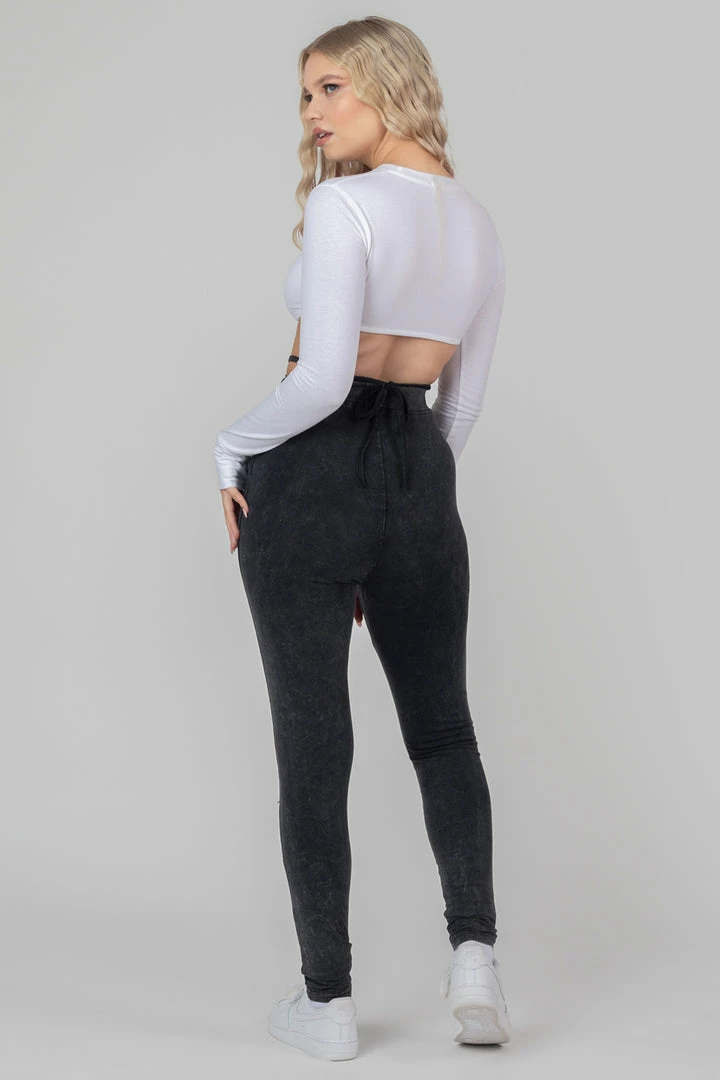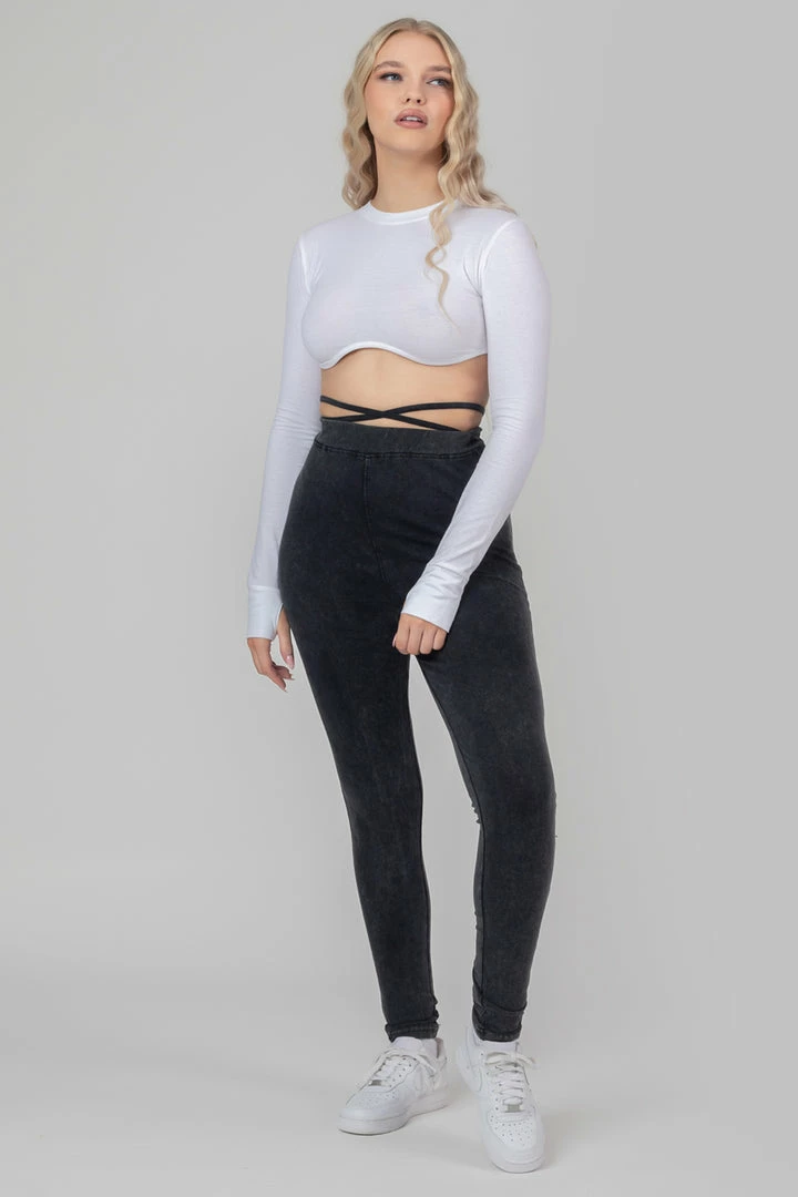 High waisted leggings in acid wash featuring a strappy tie waist detailing.