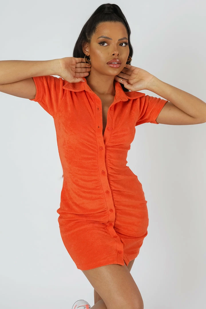 A BODYCON RUCHED FRONT BUTTON DOWN SHORT SLEEVE MINI DRESS IN ORANGE TOWELLING FEATURING DYE TO TO MATCH BUTTONS.