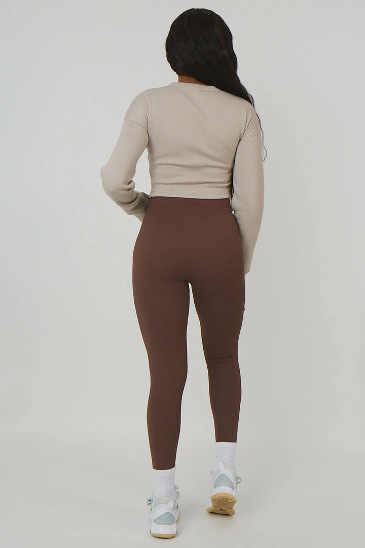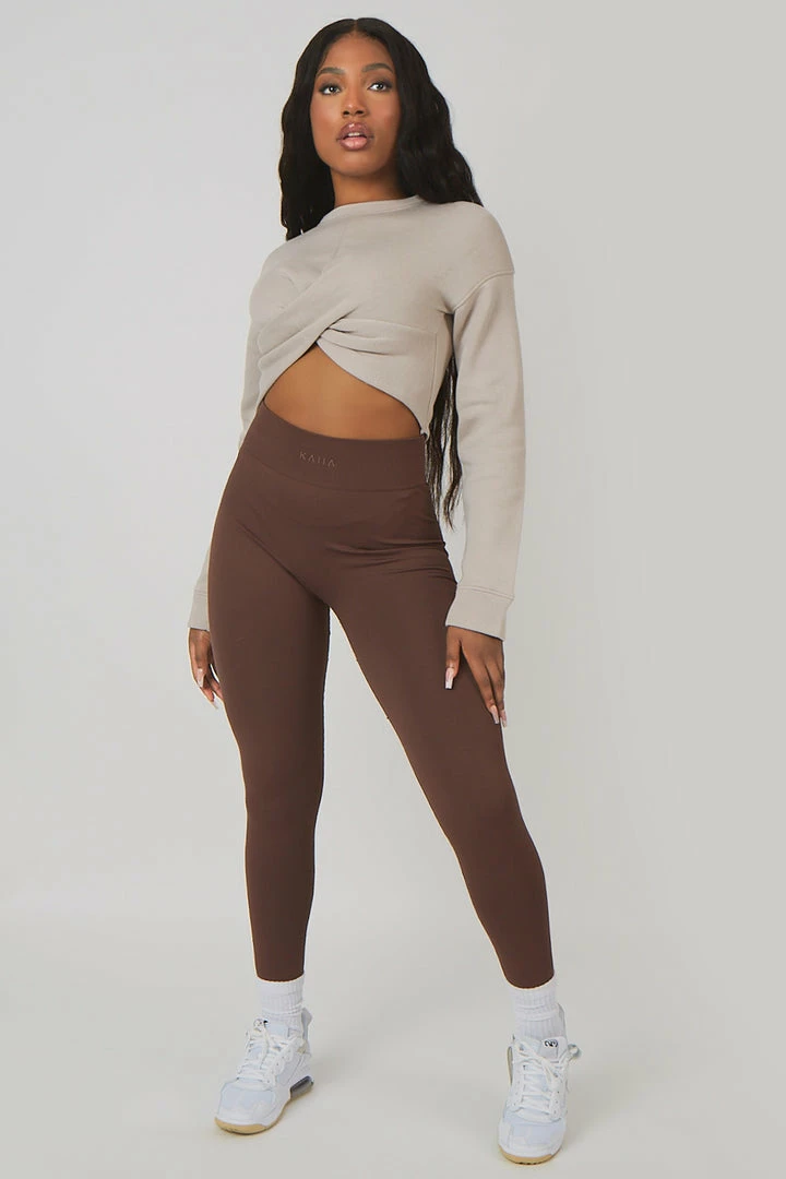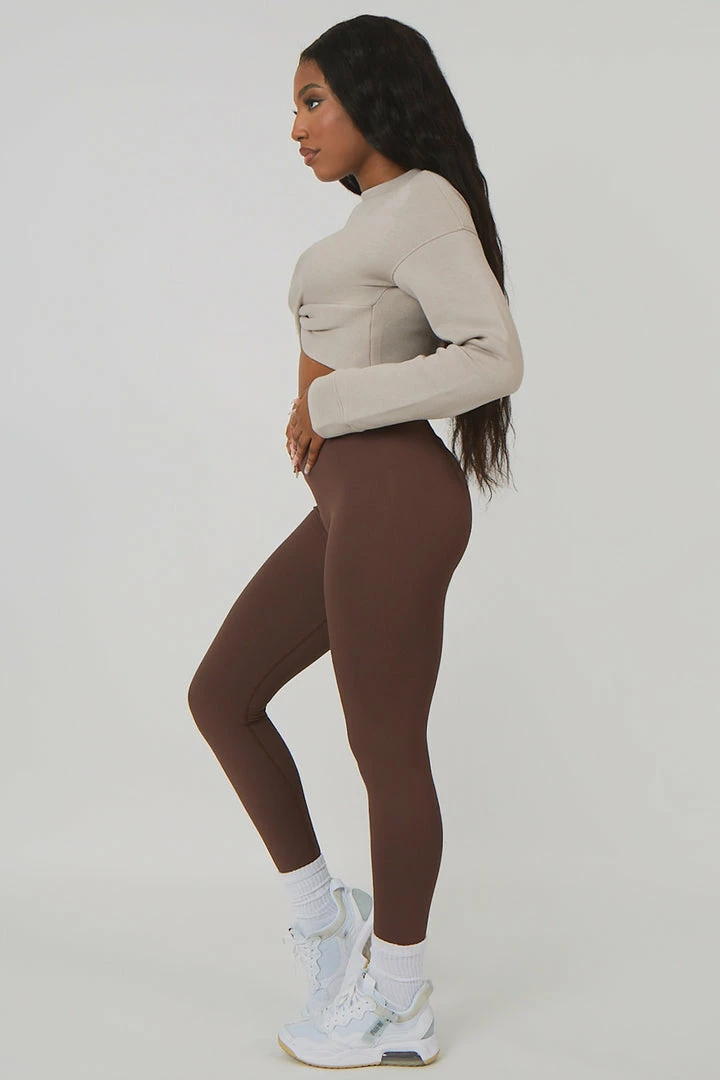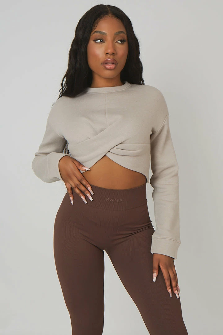 A cropped fitted sweatshirt in ash featuring a high neck and a twist detail on the front