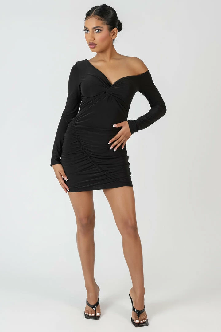 Spice up your LBD with this mini dress in a flattering slinky material featuring a twist wrap gather neckline with long sleeves.