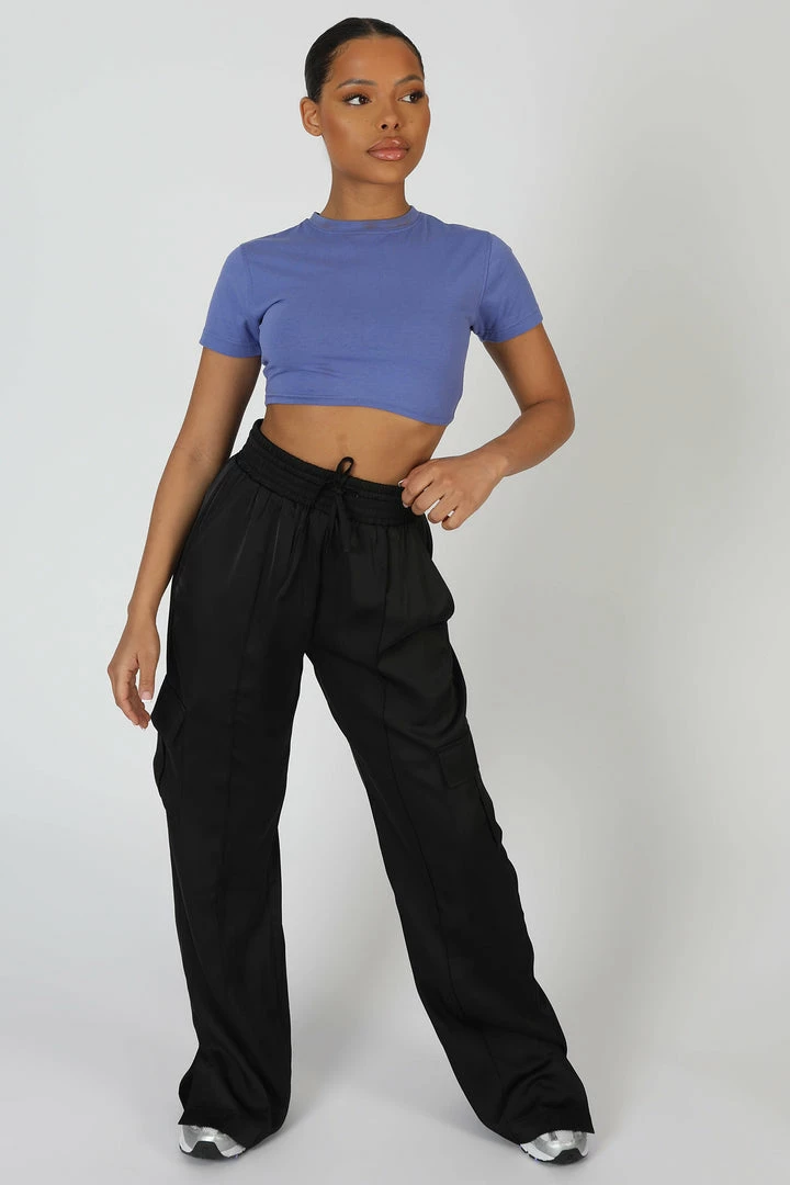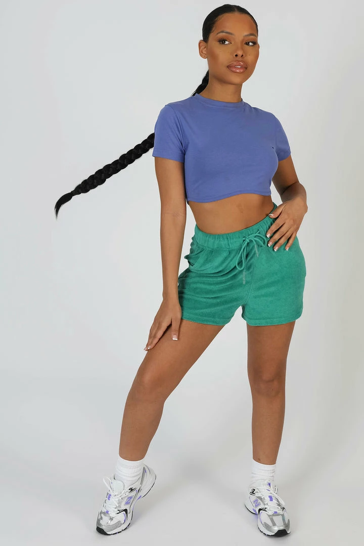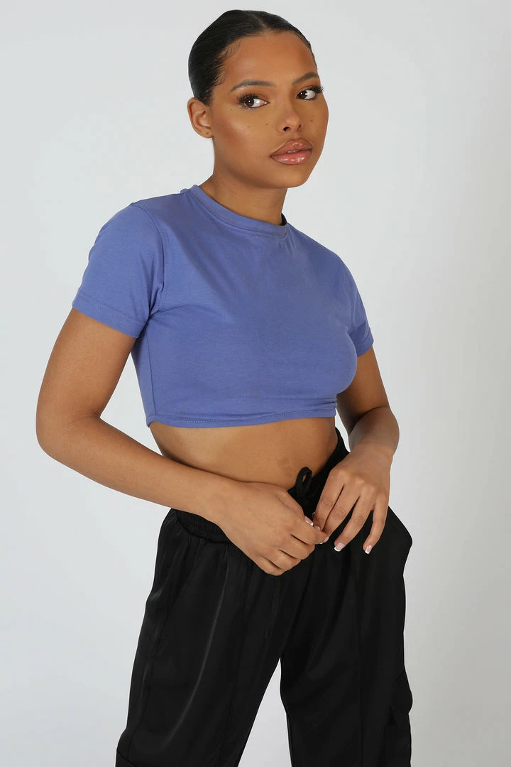 A short sleeve under bust detail super cropped t-shirt in purple with thumb hole details.