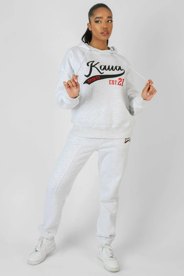 OVERSIZED FIT JOGGERS IN OATMEAL MARL WITH SEAM FRONT DETAILING AND VARSITY STYLE KAIIA BRANDING