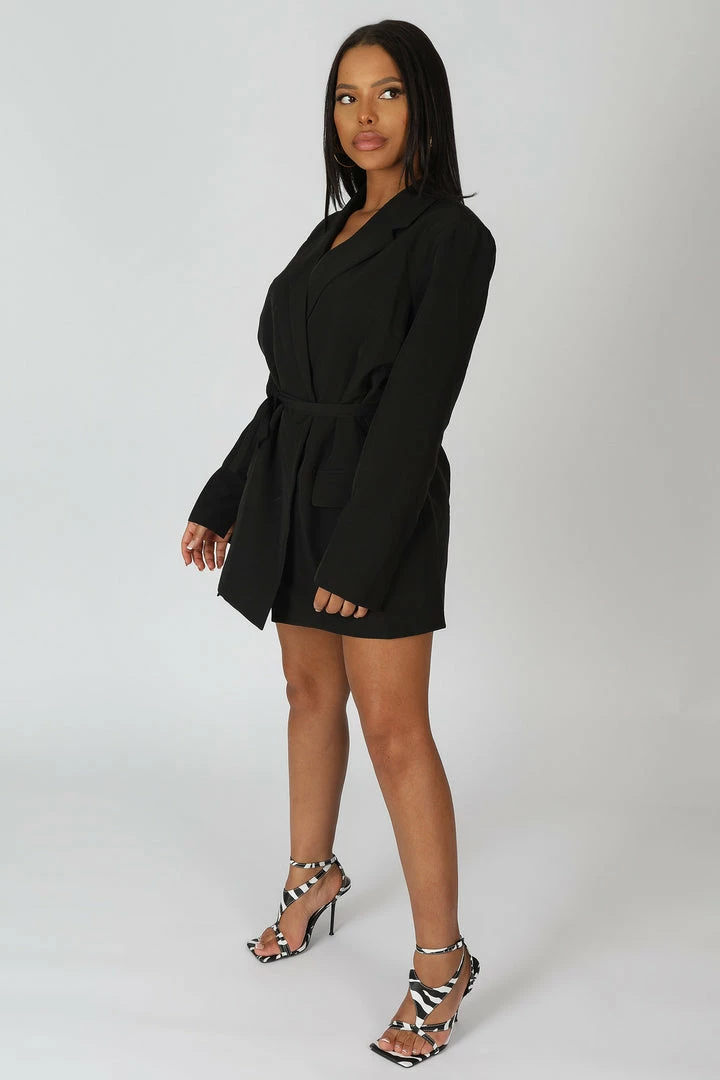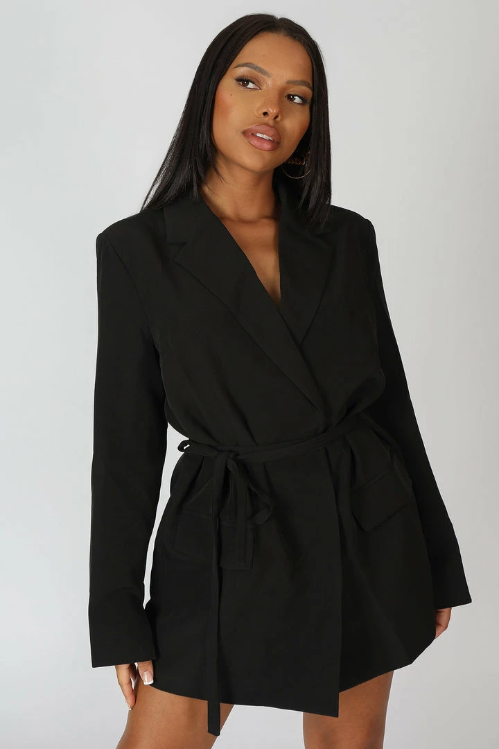OUR ICONIC TIE WAIST MINI BLAZER DRESS NOW IN BLACK.