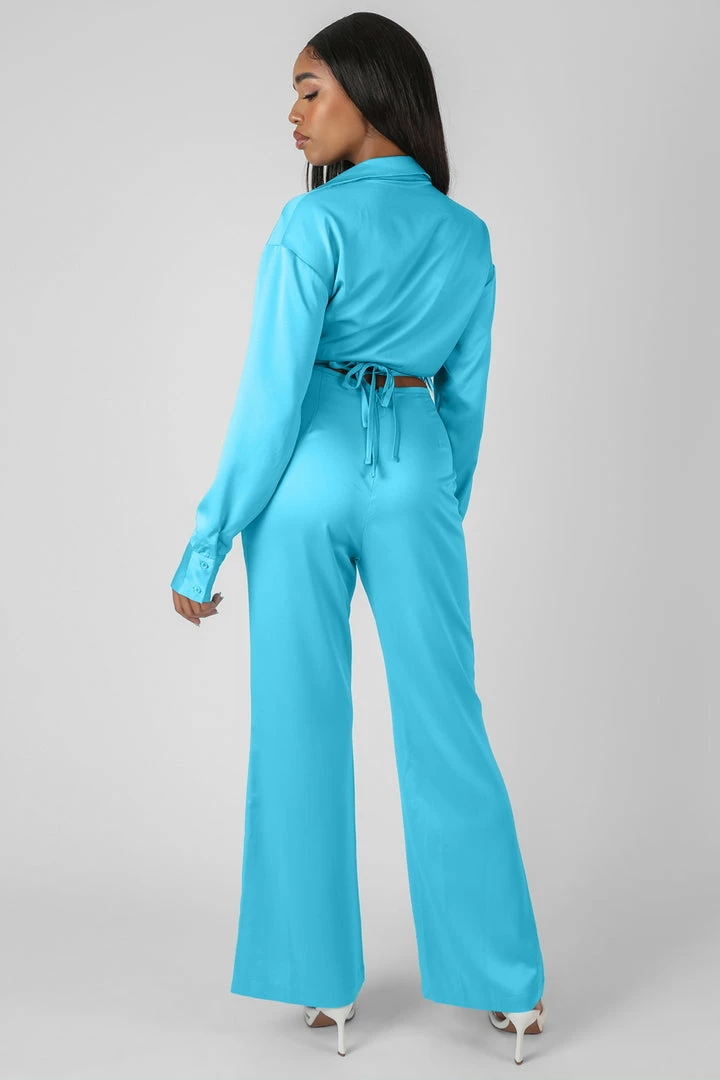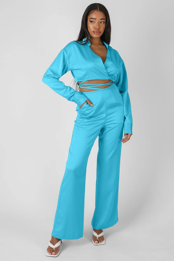 A wrap around cropped shirt in a blue satin with a strappy waist detail
